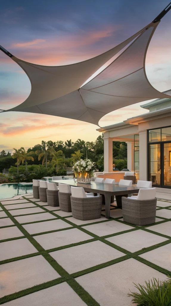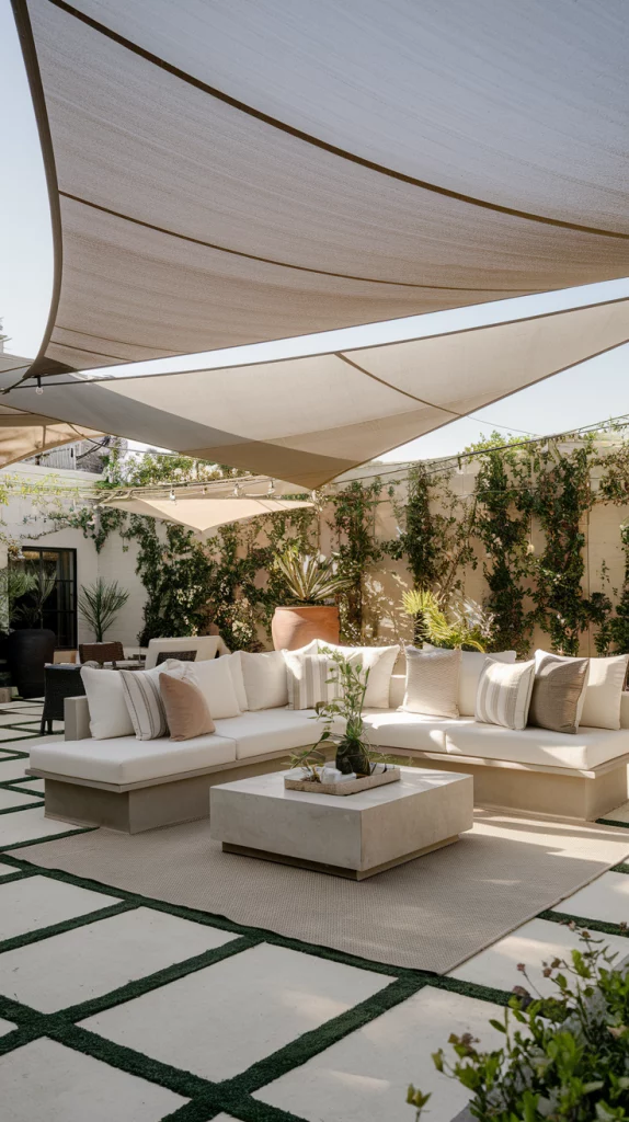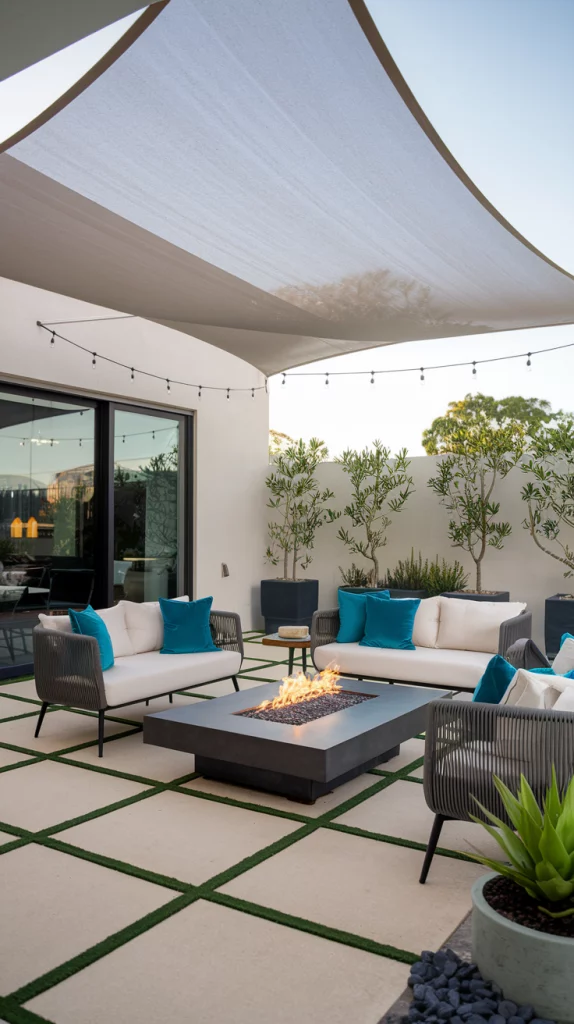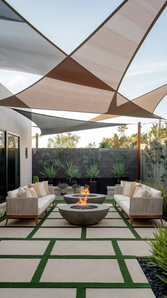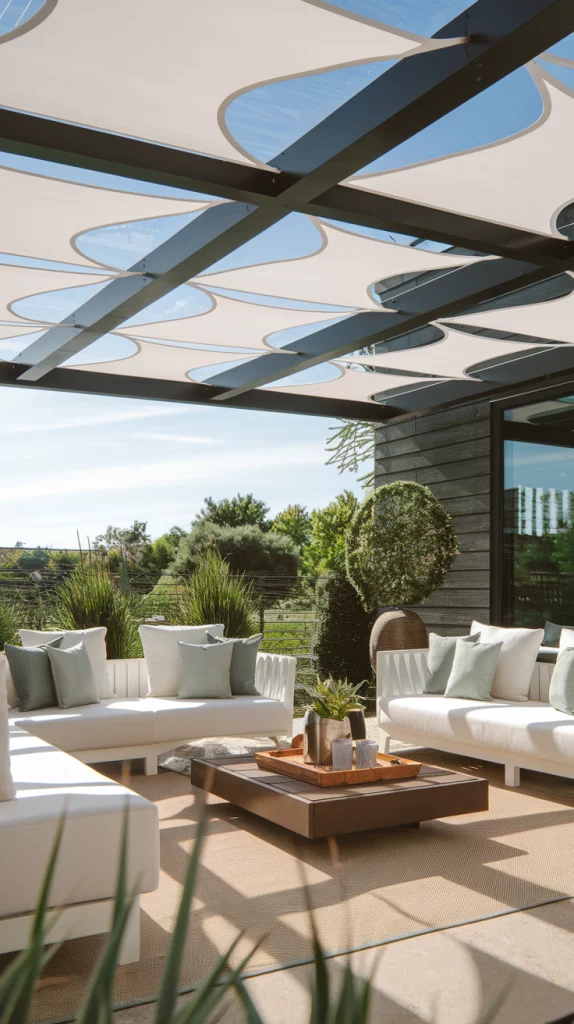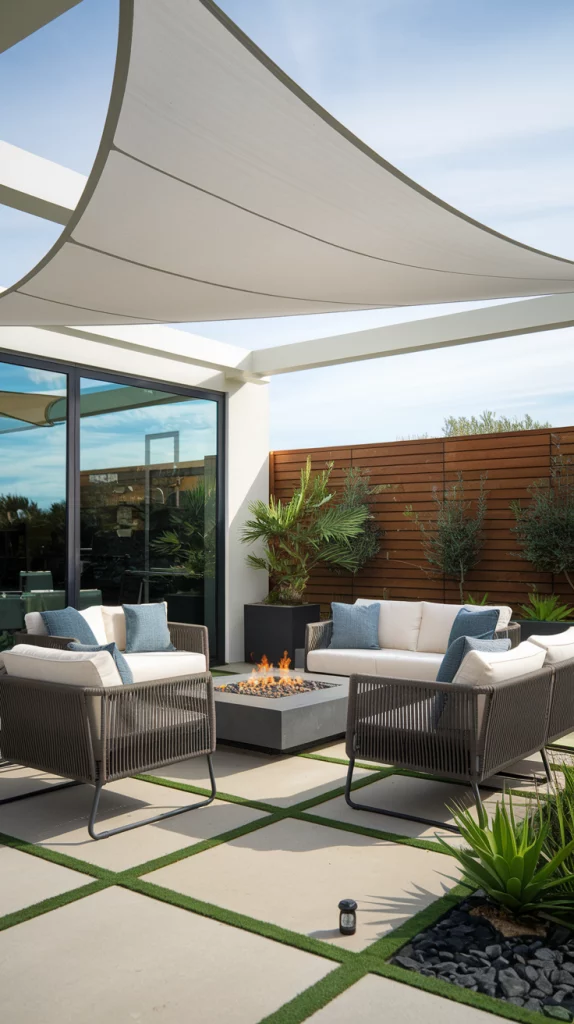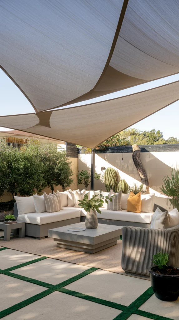 Shade sails are an affordable, stylish, and versatile way to cover patios. Available in triangular or rectangular shapes, these weather-resistant fabric shades provide excellent UV protection. Layering multiple shade sails in complementary colors creates a unique, artistic effect that enhances the patio’s modern aesthetic.