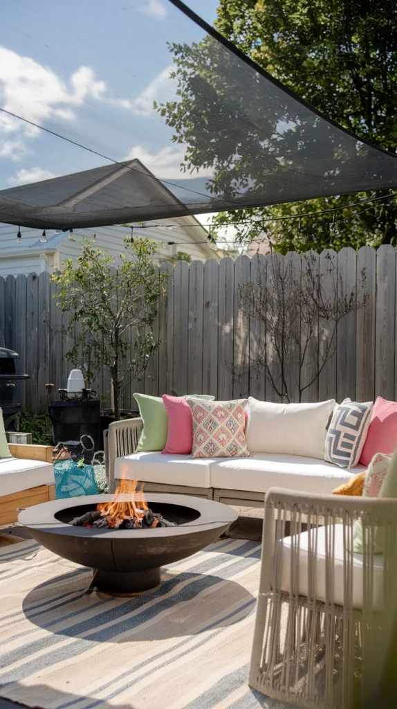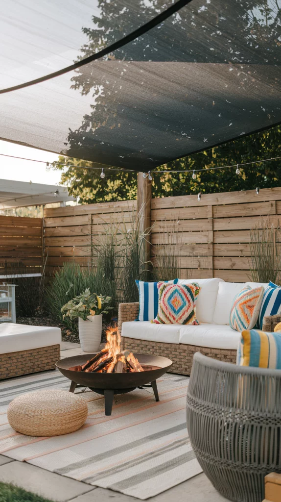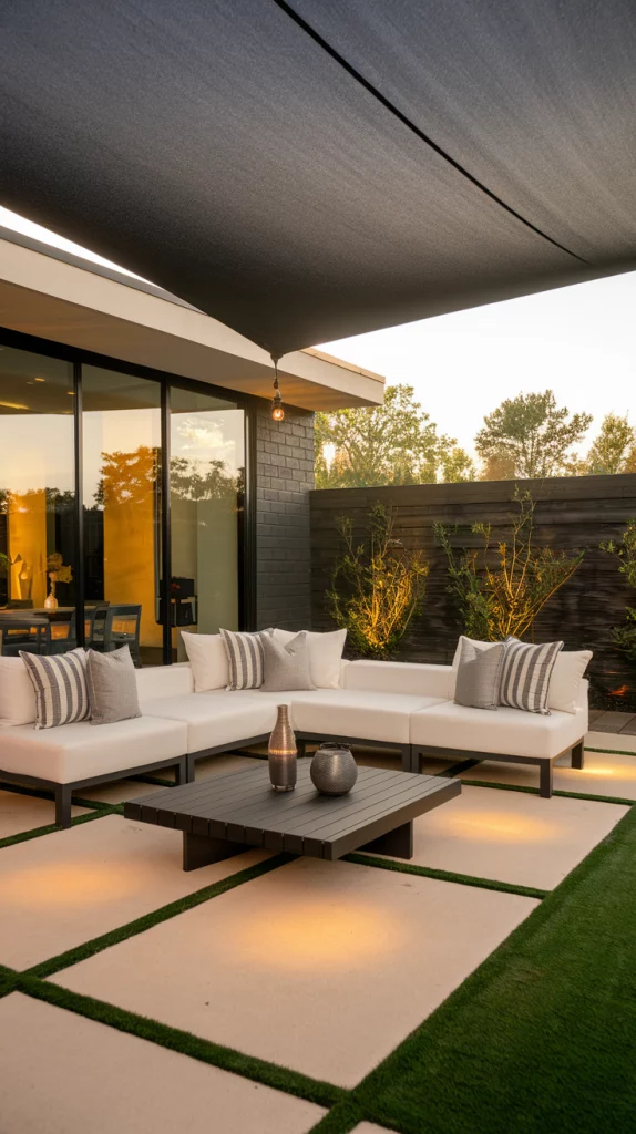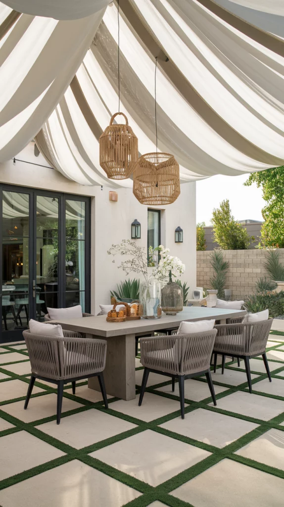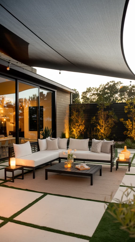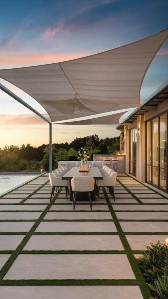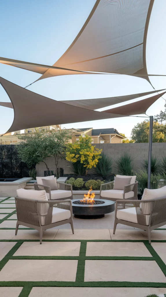 Shade sails are an affordable, stylish, and versatile way to cover patios. Available in triangular or rectangular shapes, these weather-resistant fabric shades provide excellent UV protection. Layering multiple shade sails in complementary colors creates a unique, artistic effect that enhances the patio’s modern aesthetic.