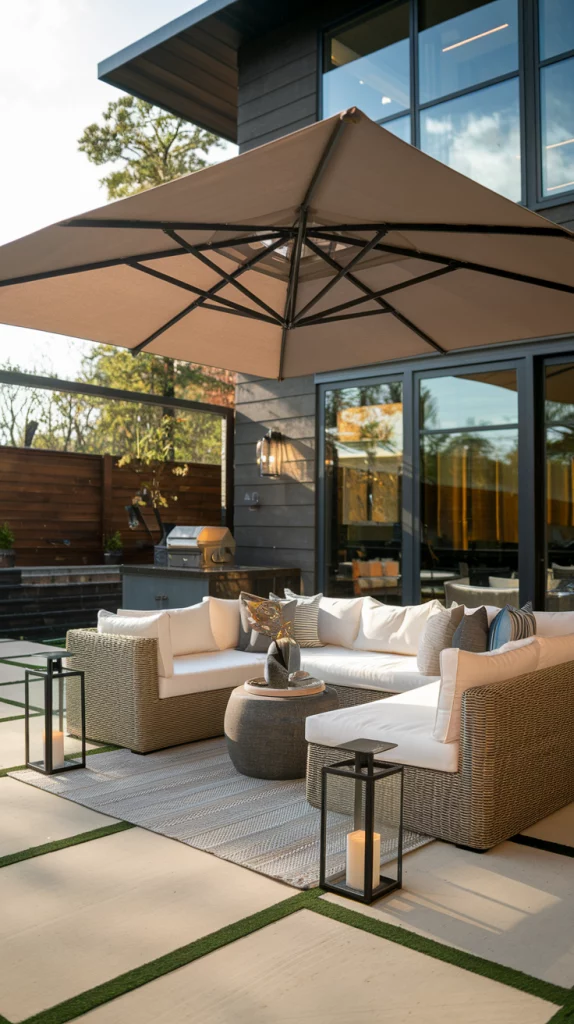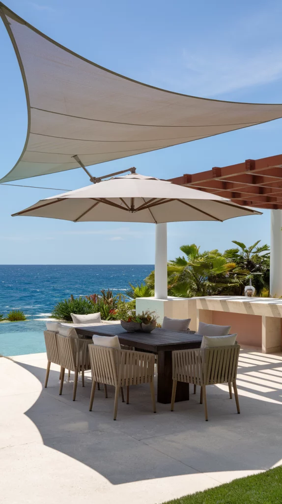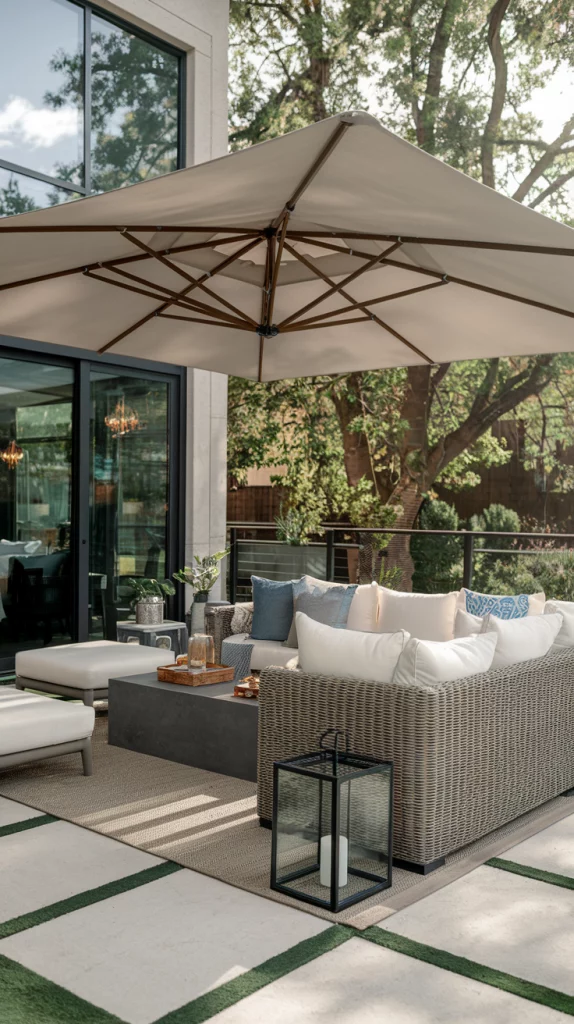 Cantilever umbrellas provide ample shade without obstructing seating areas. These large, freestanding umbrellas rotate and tilt, making them perfect for outdoor lounges and dining areas. Their sturdy bases and weather-resistant fabric ensure durability. Pairing them with sleek outdoor furniture enhances both function and style.