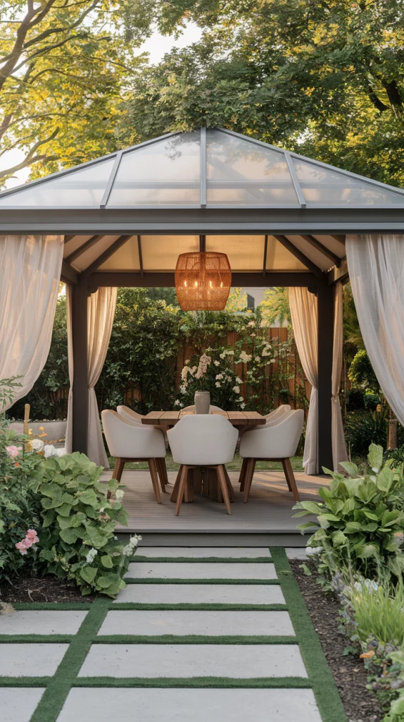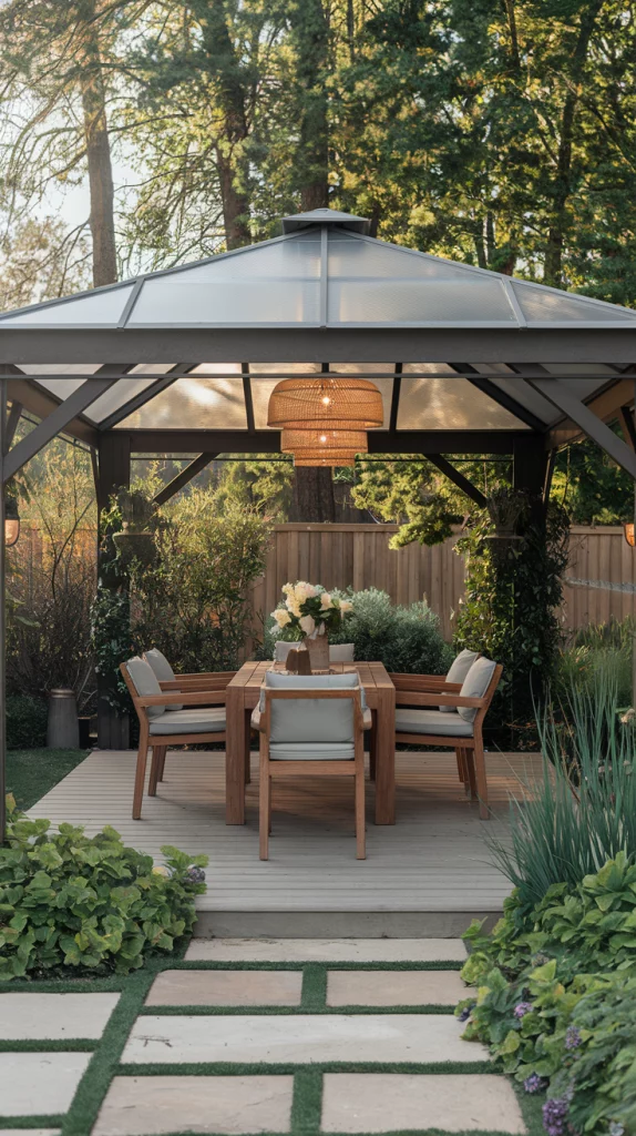 A gazebo with a UV-resistant roof provides full sun protection while adding an elegant architectural element to your patio. These freestanding structures can be made from wood, metal, or vinyl, with roofing materials like polycarbonate panels, metal sheets, or fabric canopies. They are perfect for outdoor dining areas, lounge spaces, or garden retreats, offering year-round durability and weather resistance.