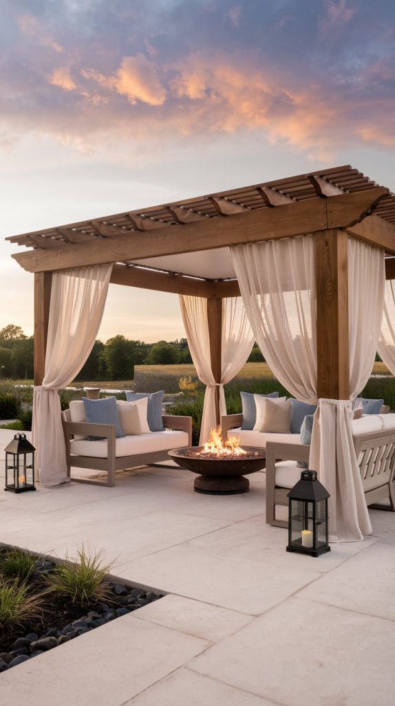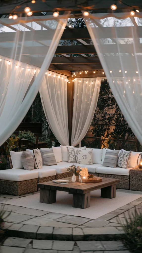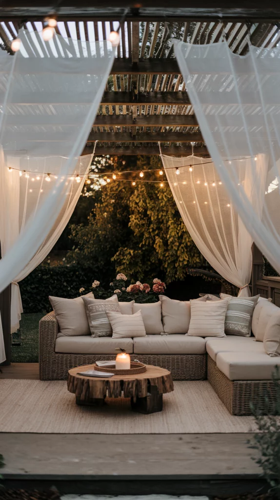 A wooden pergola with flowing fabric drapes blends sophistication and function, offering a stylish and inviting space for relaxation. Drapes made from weather-resistant fabric can be tied back for an open look or pulled across for added shade and privacy. This setup pairs beautifully with wooden or rattan patio furniture, cozy cushions, and string lighting, creating an effortlessly elegant setting.