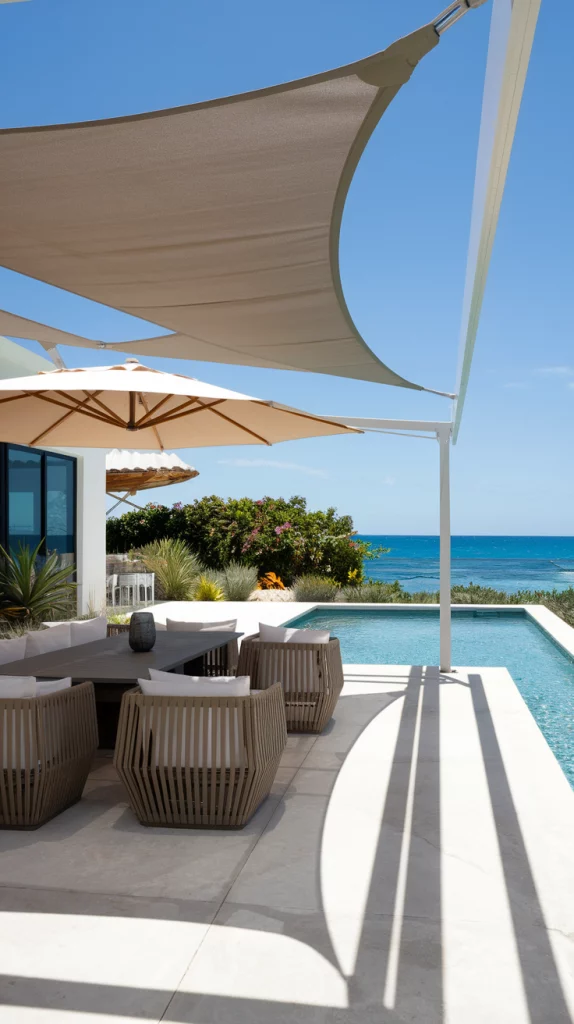 Tensioned fabric shades offer a sleek, architectural look while providing excellent sun protection. These highly durable and UV-resistant fabrics are stretched tightly over a metal or wooden frame, creating a stylish, futuristic aesthetic. Perfect for modern patios, rooftop terraces, or poolside lounges, they provide ample coverage without feeling enclosed.