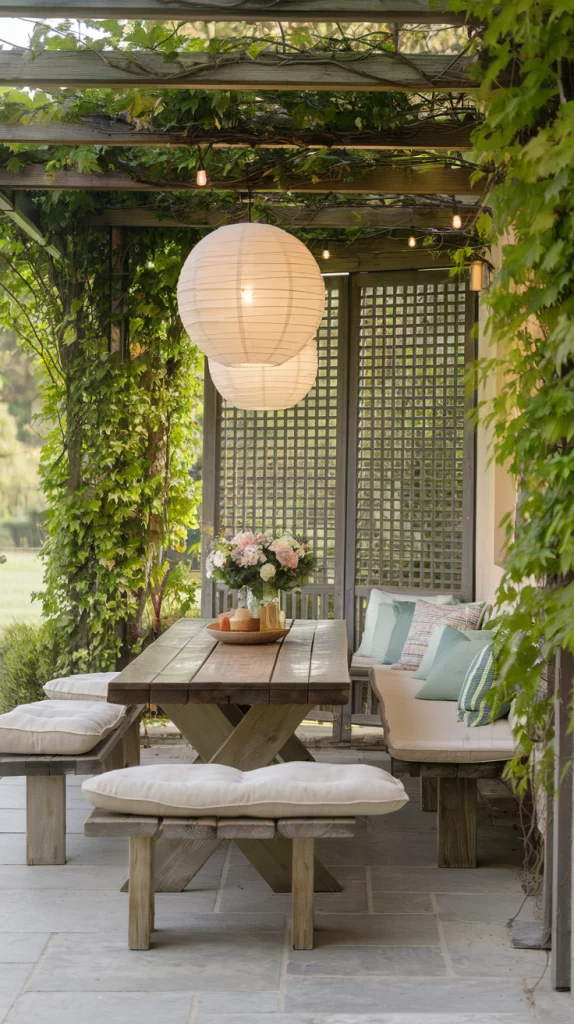 Lattice panels are a decorative and functional way to provide partial shade while maintaining an airy feel. Combined with climbing plants like ivy, clematis, or roses, they create a natural sun filter that enhances the beauty of your patio, deck, or garden area. This semi-open design allows for dappled sunlight, making it ideal for cozy seating areas or outdoor dining spaces.