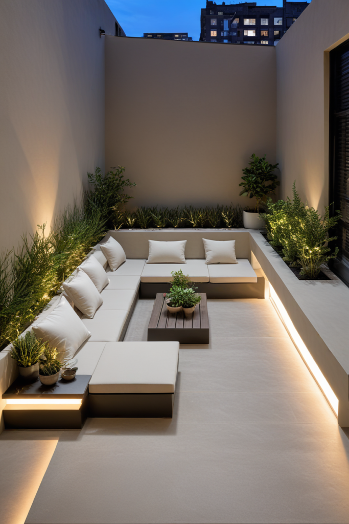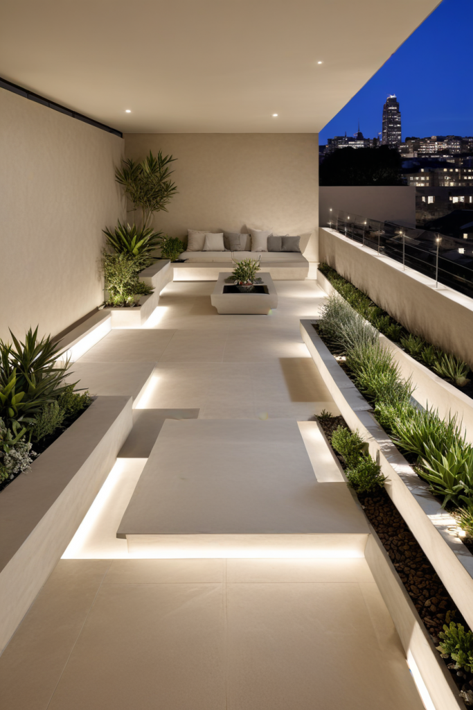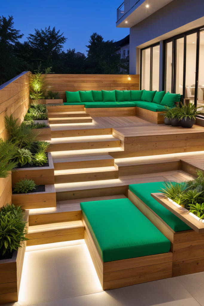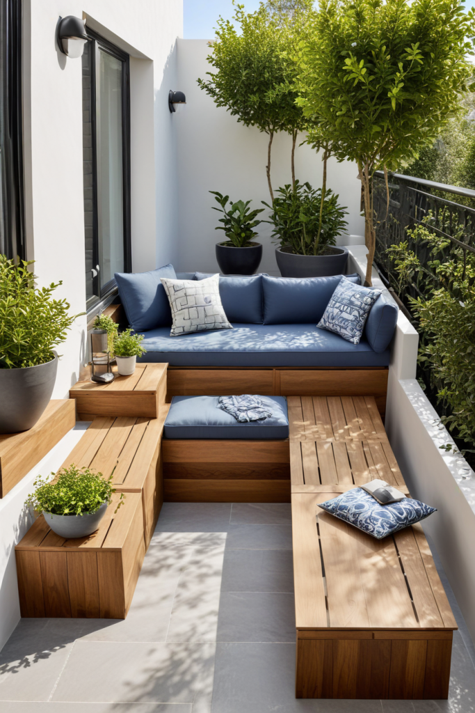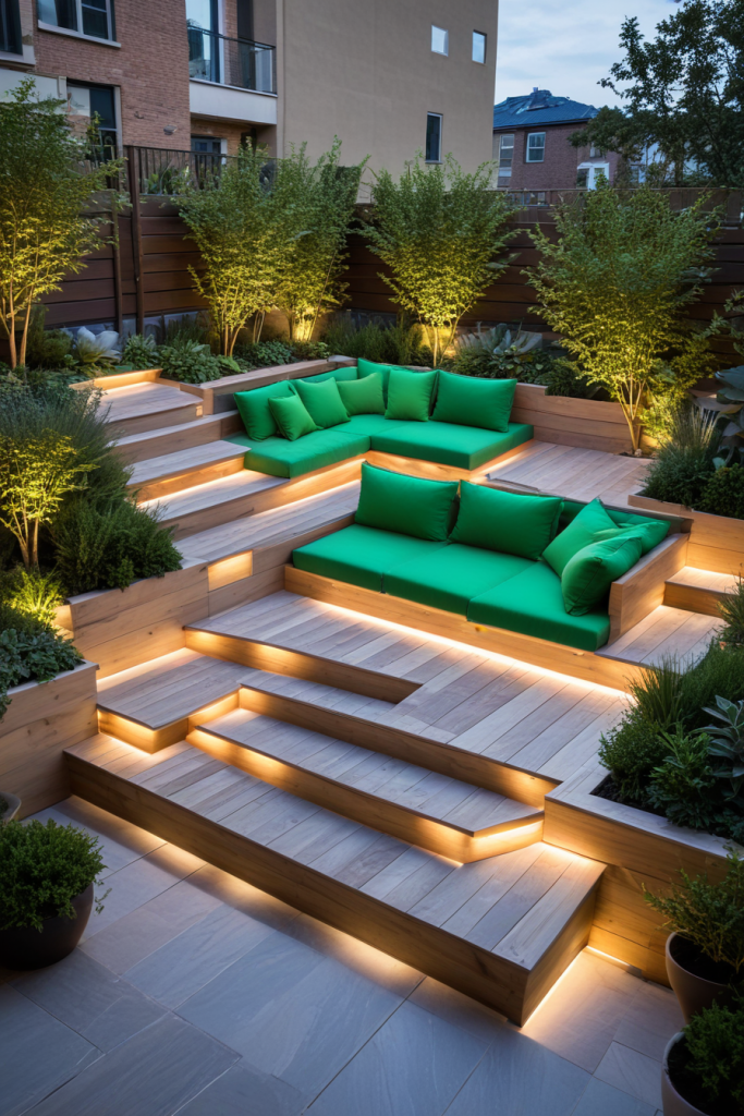 A multi-level terrace is a dynamic way to maximize outdoor space while adding architectural interest. Use built-in concrete or wooden seating with plush weather-resistant cushions to create distinct areas for lounging and dining. Integrate LED step lighting and layered planters to enhance depth and make each level feel connected yet unique.
