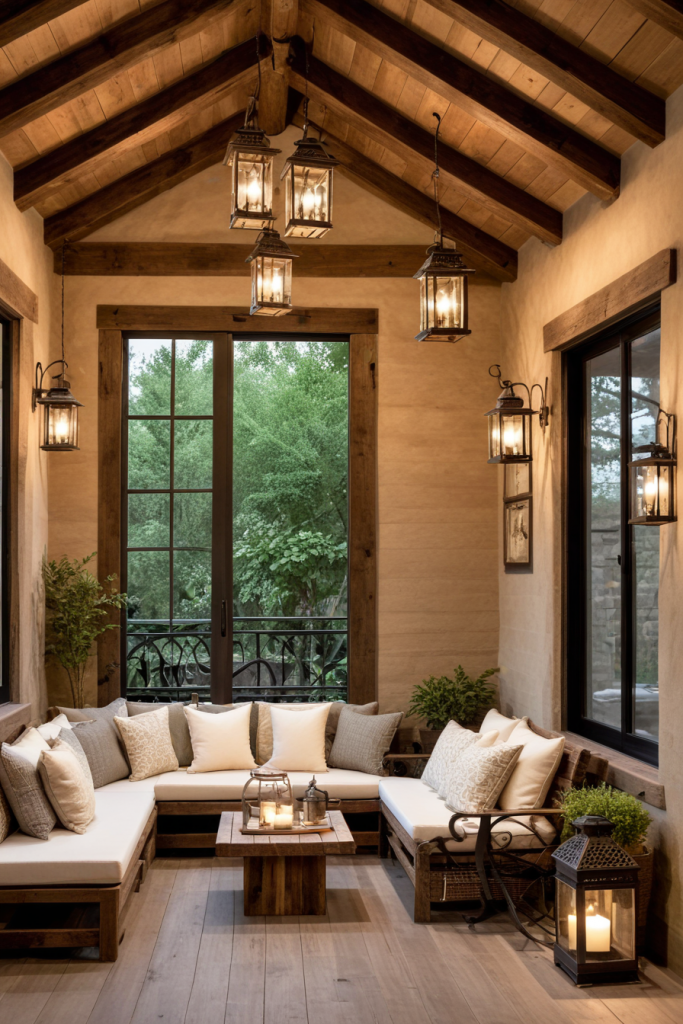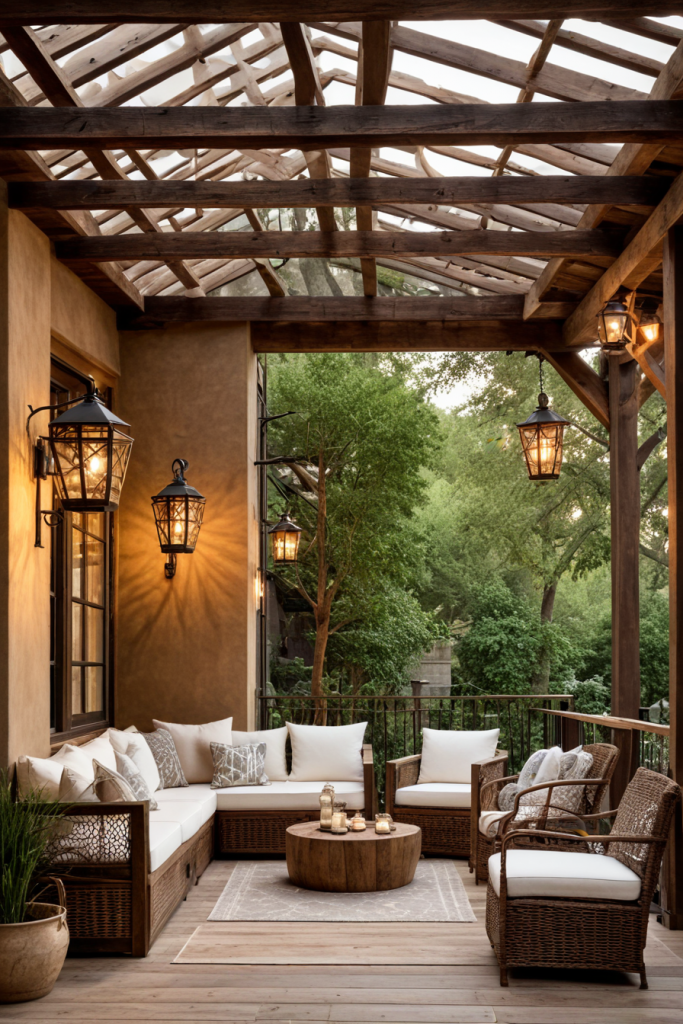 A rustic terrace highlights wooden elements, stone textures, and warm earthy tones. Use reclaimed wood furniture, wicker seating, and iron lanterns for an organic, inviting look. Incorporate exposed beams and soft lighting to enhance the cozy vibe.