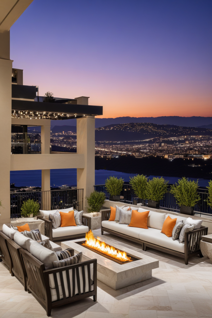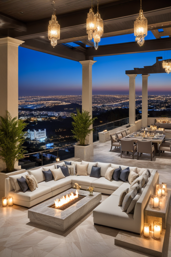 For a luxurious terrace, opt for premium outdoor furniture, plush seating, and elegant decor. Incorporate marble or stone flooring, statement lighting, and a fire feature for warmth. Consider outdoor chandeliers and designer furniture to elevate the aesthetic.
