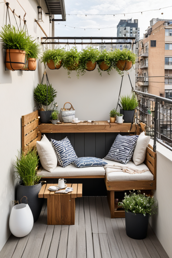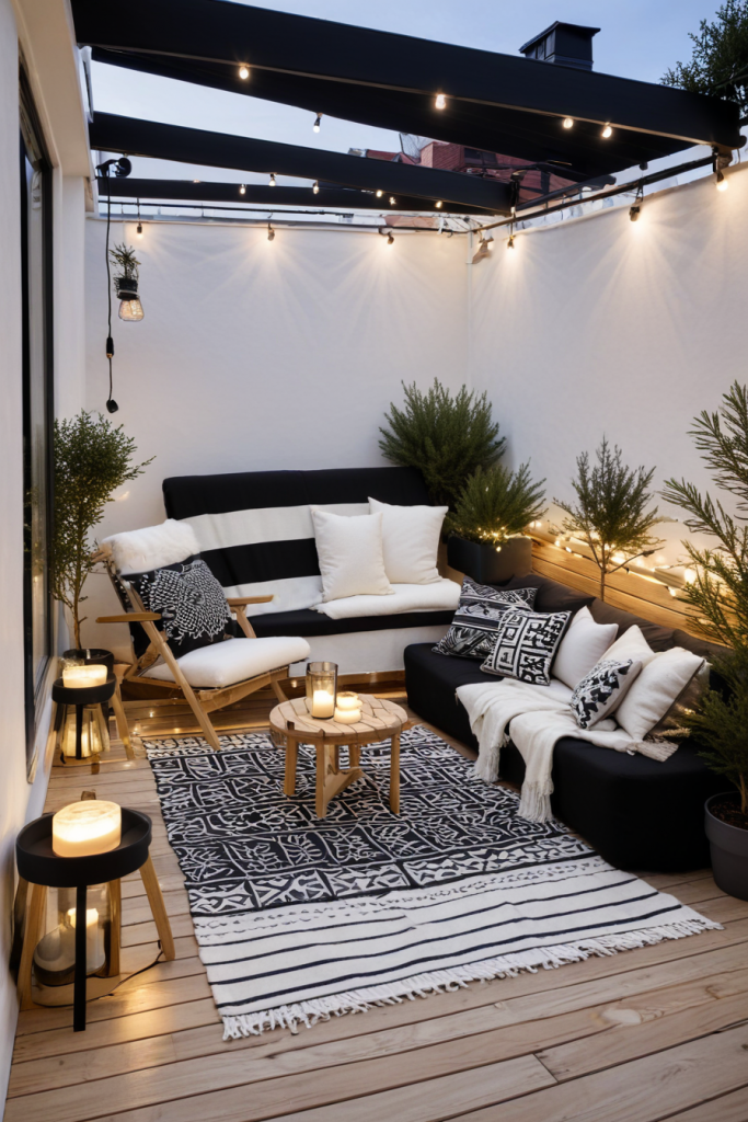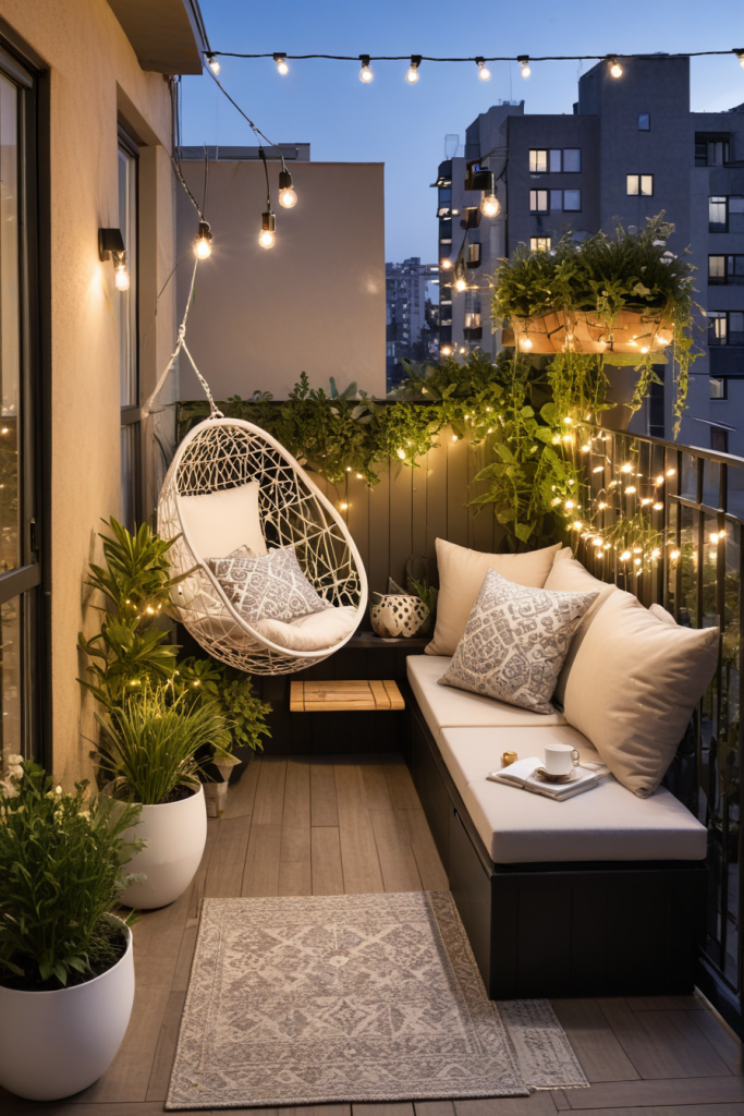 For small apartment balconies, smart space utilization is key. Opt for foldable furniture, built-in benches with storage, and vertical planters to maximize space. Use neutral tones to create an open feel, while string lights and soft textiles add warmth. A tiny coffee table and a hanging egg chair can complete the cozy ambiance, making even the smallest terrace feel like a retreat.