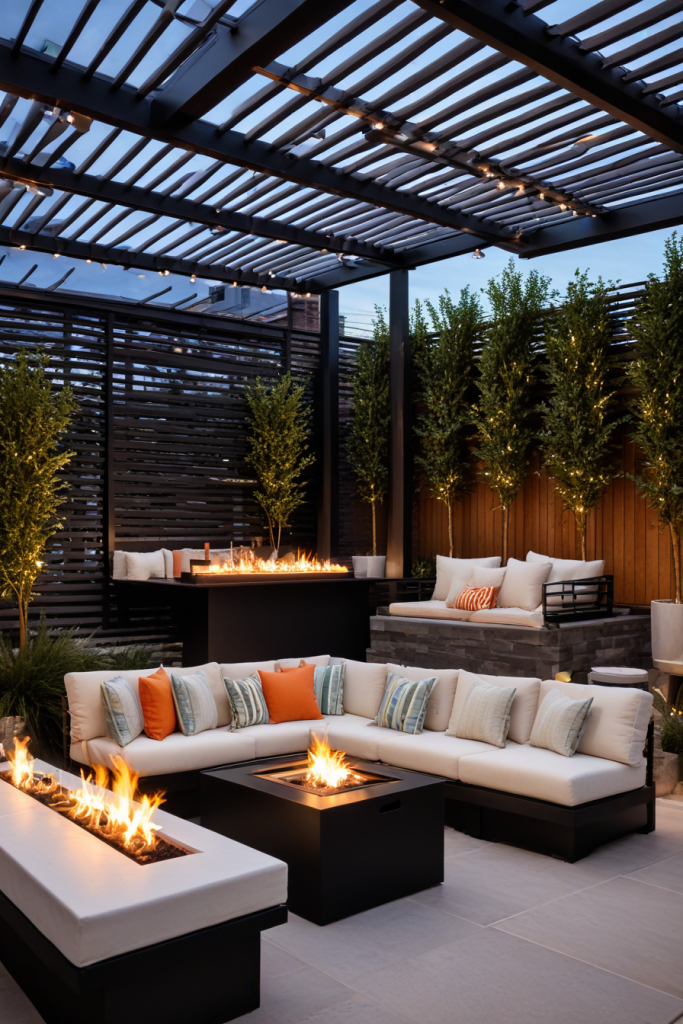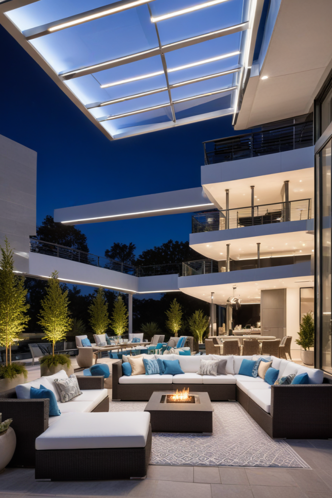 An open-air terrace with a retractable roof offers flexibility, allowing you to enjoy the sun while staying protected from the elements. Choose weather-resistant furniture like rattan or teak seating, and add a sleek fire pit or heating lamps for cooler nights. Use slatted pergolas or motorized awnings to control sunlight exposure, making it perfect for year-round use.