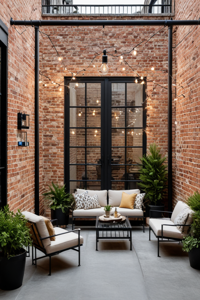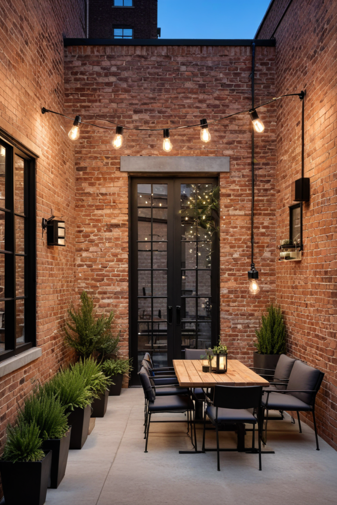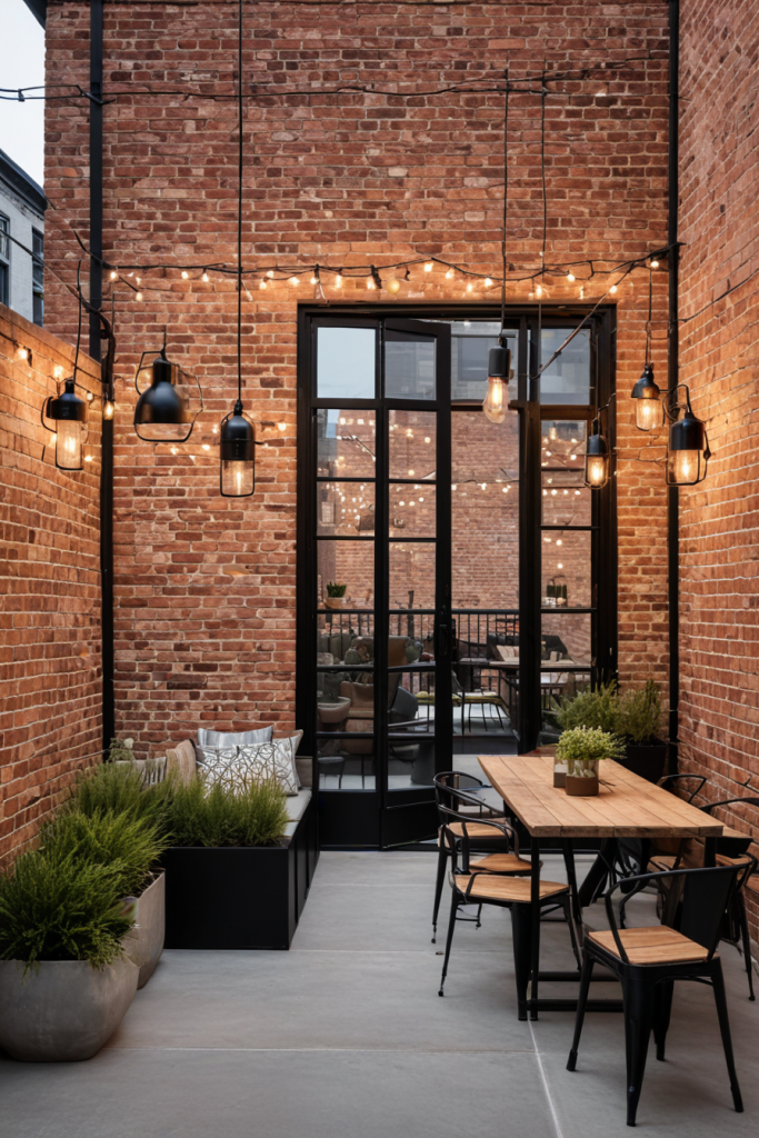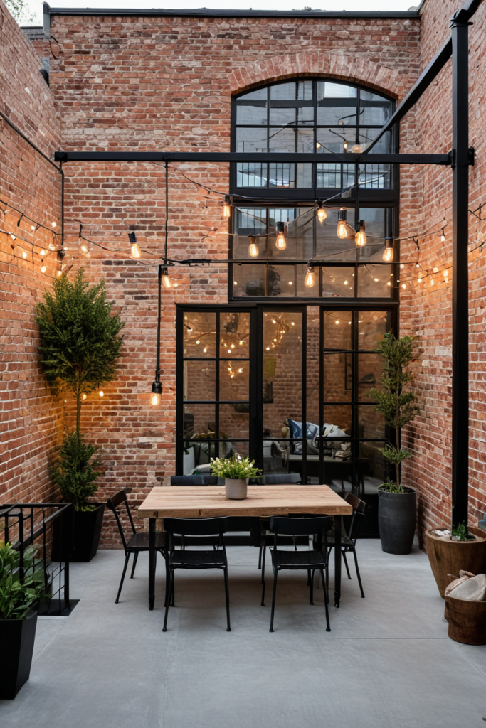An industrial-style terrace combines raw materials, metal accents, and exposed brick walls to create an edgy urban aesthetic. Choose steel-framed furniture with wooden elements, and use Edison bulb string lights for a moody ambiance. Add concrete planters, black iron lanterns, and distressed leather seating for a bold, sophisticated look.