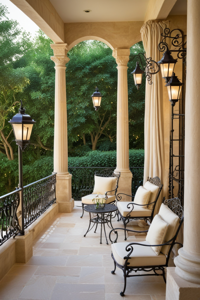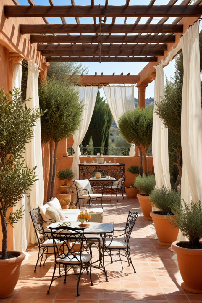 A Mediterranean terrace captures the charm of sun-drenched villas with warm earthy tones, terracotta tiles, and wooden pergolas. Use wrought iron furniture with plush cushions, and add potted olive trees, clay planters, and decorative lanterns to complete the ambiance. Soft white drapes create a breezy, coastal feel, making it an inviting space to relax.