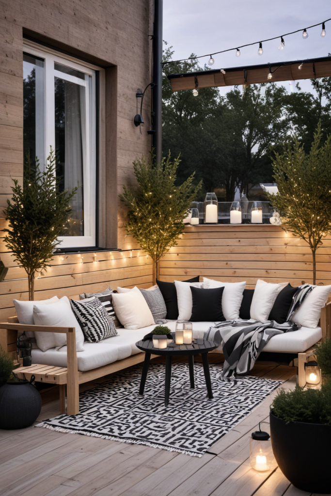 A Scandinavian terrace focuses on neutral hues, functional furniture, and natural textures. Use light wood decking, minimalist seating, cozy wool throws, and subtle black or white decor for a clean, sophisticated aesthetic. Incorporate soft lighting like lanterns or LED candles to maintain a cozy yet minimal ambiance.