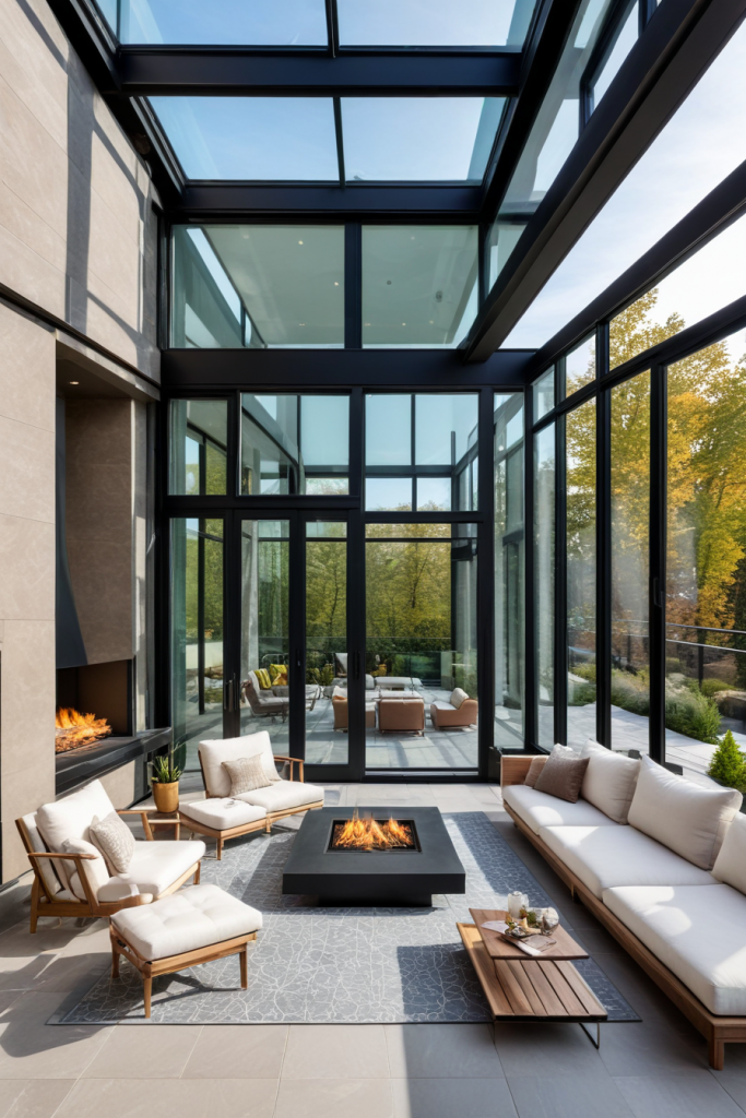A glass-enclosed terrace offers a climate-controlled outdoor experience, perfect for all seasons. Opt for floor-to-ceiling glass panels, sleek modern furniture, and indoor plants to create a seamless indoor-outdoor transition. Use smart lighting, heated flooring, or an electric fireplace to enhance comfort while maintaining a chic, contemporary look.