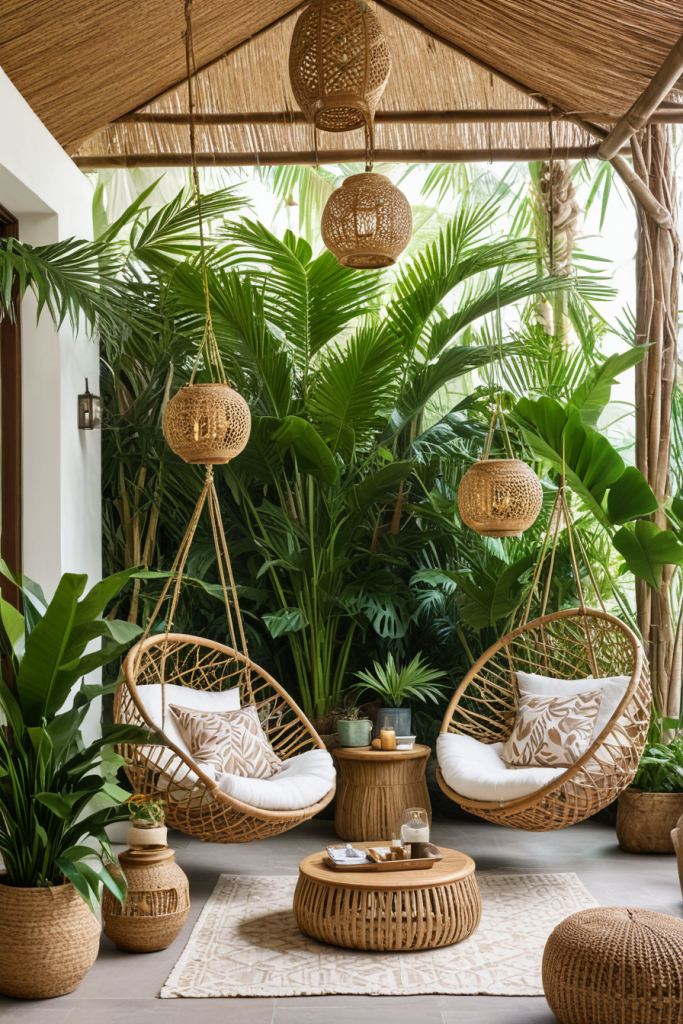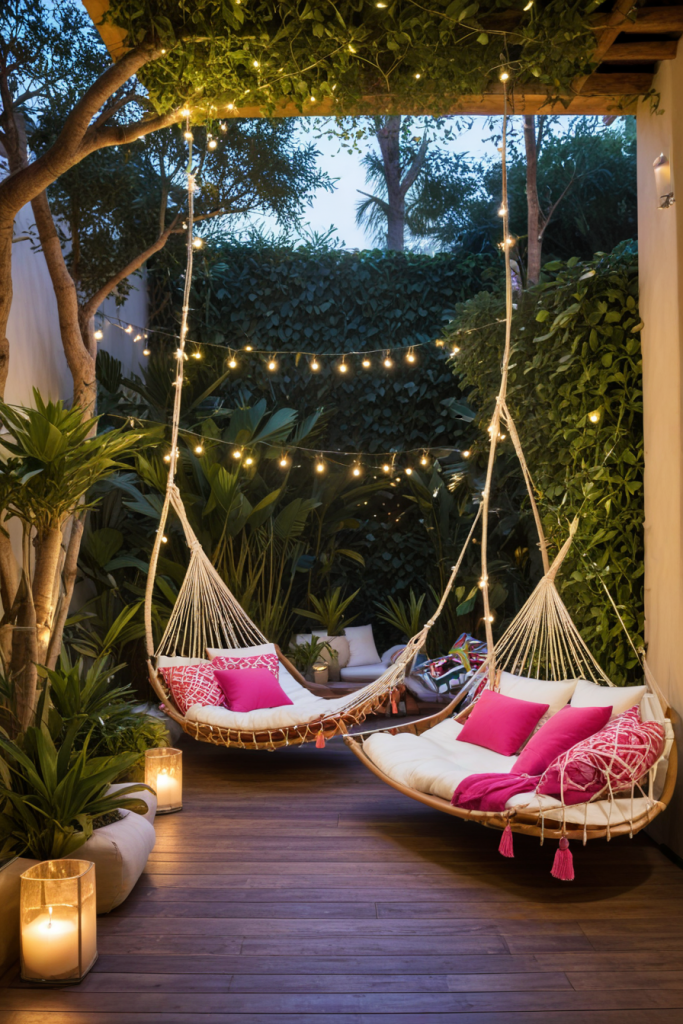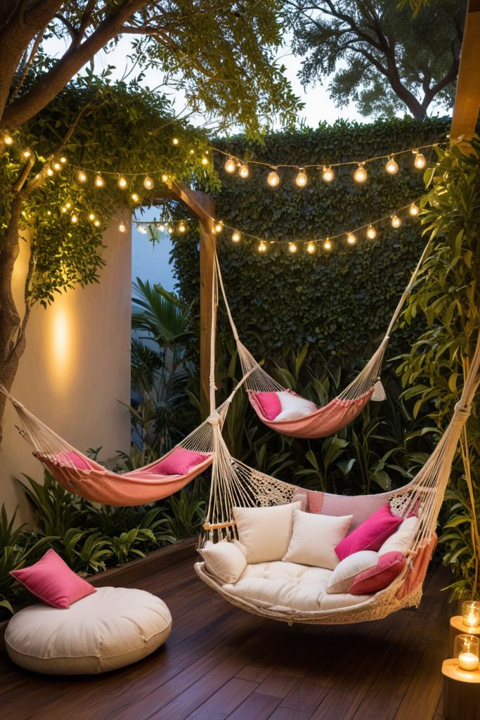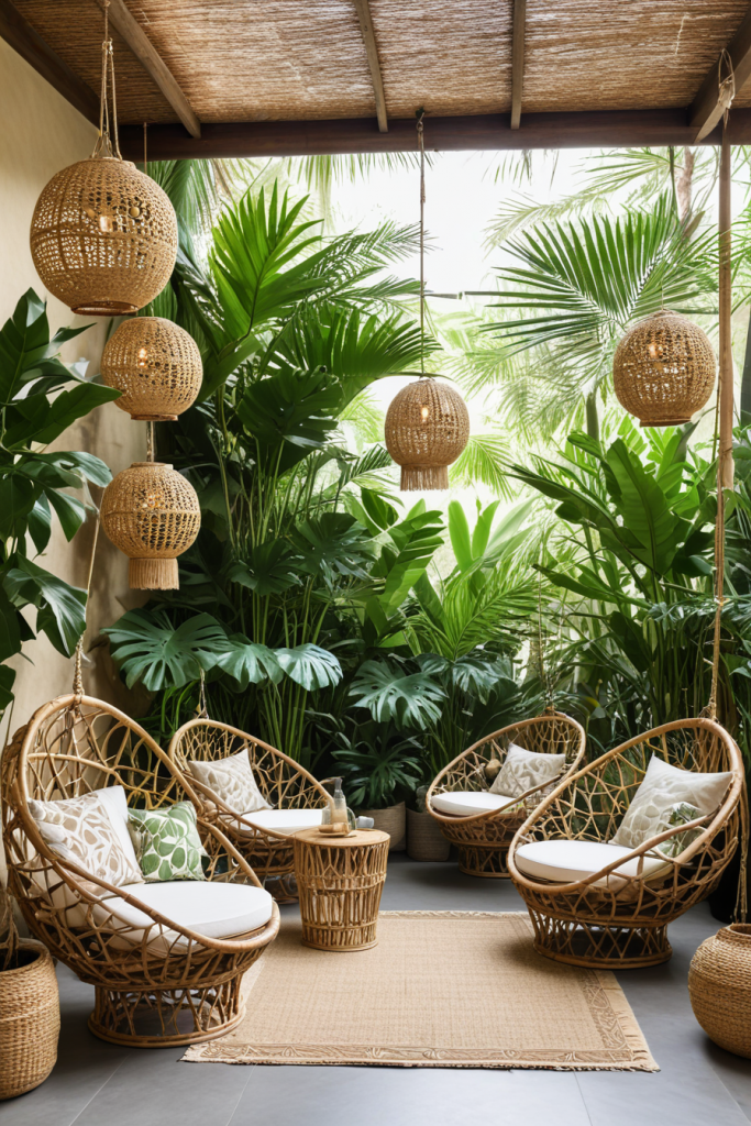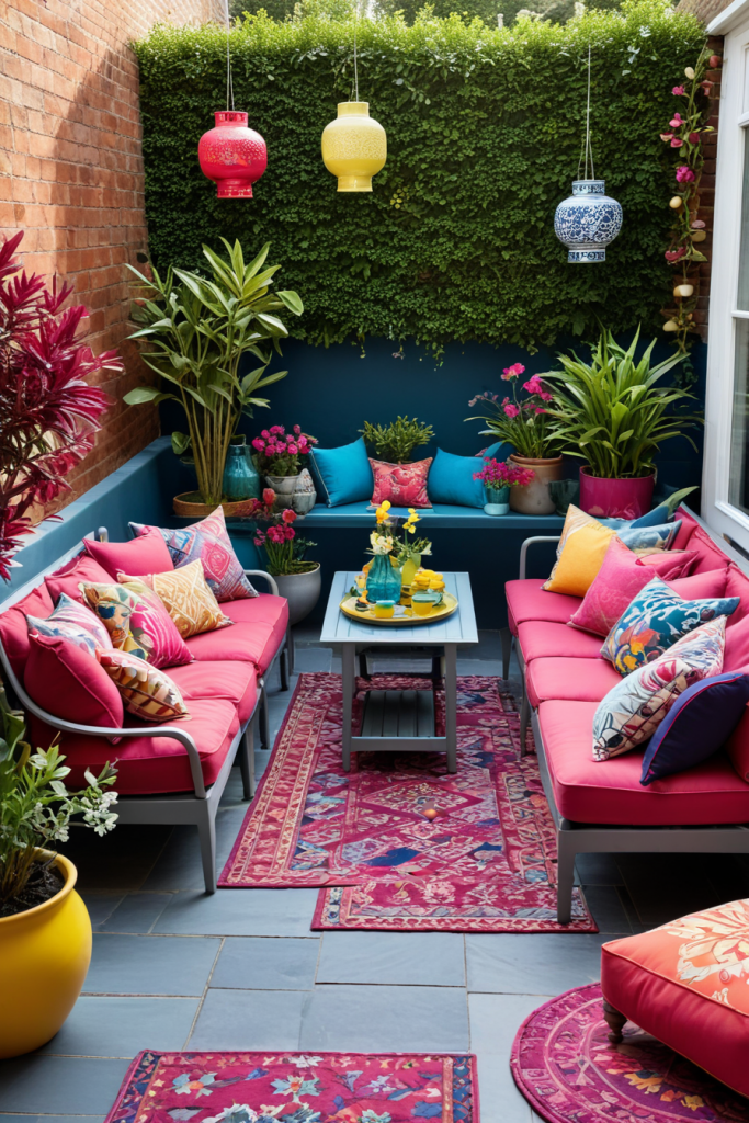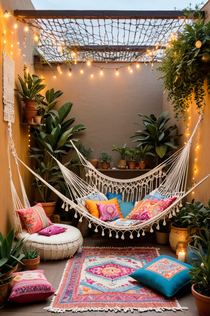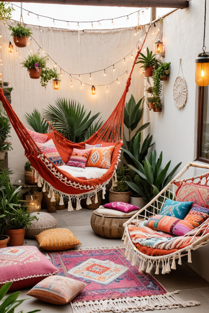 A bohemian terrace is all about warm colors, layered textiles, and artistic decor. Use floor cushions, patterned rugs, woven hammocks, and macrame wall hangings to create an eclectic yet relaxed atmosphere. String lights or lanterns enhance the cozy ambiance, perfect for unwinding with friends.