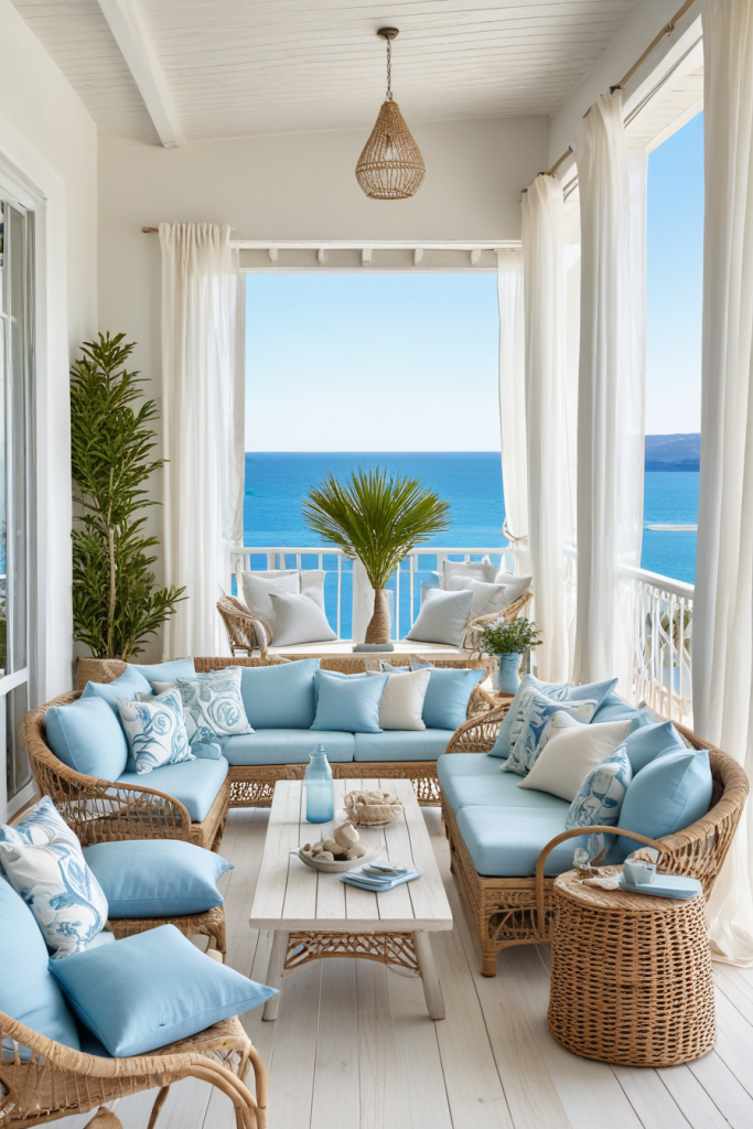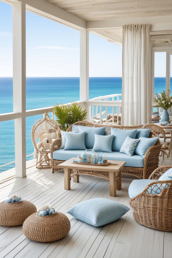 A coastal-inspired terrace embraces light, airy colors, natural materials, and a relaxed beachy vibe. Use whitewashed wood flooring, rattan or wicker furniture, and light blue and beige textiles to create an oceanfront ambiance. Complement the look with soft linen curtains, driftwood decor, and seashell-inspired accessories, evoking a tranquil seaside retreat.