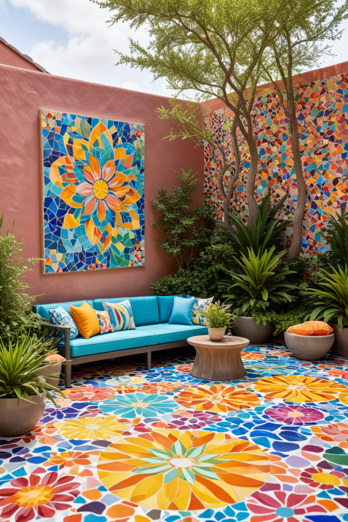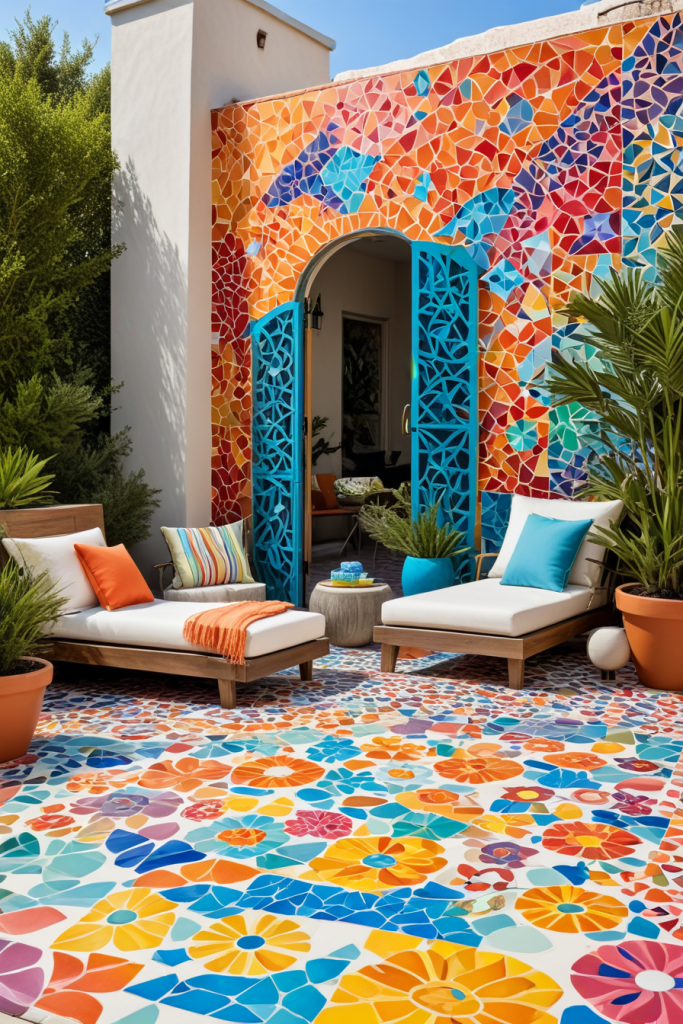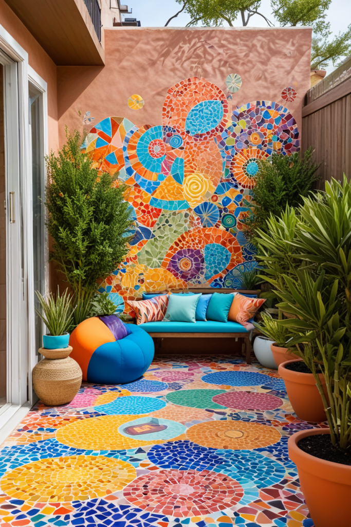 An artistic terrace transforms outdoor spaces into creative havens with bold wall murals, sculptural installations, and unique furniture pieces. Opt for colorful mosaic flooring, metal or ceramic art pieces, and abstract-patterned outdoor rugs to enhance the vibrancy. Add custom-painted walls or a graffiti feature to give the space an eclectic and modern touch.
