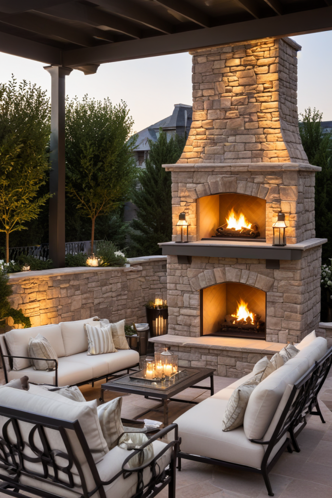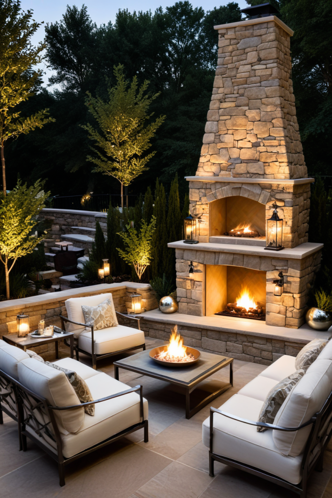 An elegant terrace with a fireplace adds warmth, sophistication, and a luxurious feel to any outdoor space. Opt for a stone or marble fireplace, chic lounge chairs with high-end upholstery, and a glass coffee table to create a refined atmosphere. Enhance the look with soft ambient lighting, metallic accents, and plush throws, making it a cozy yet stylish retreat for all seasons.