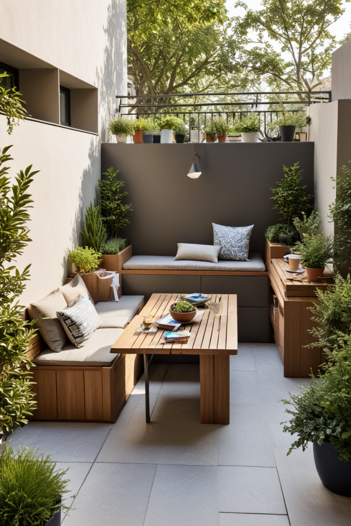A functional terrace balances style and practicality, incorporating hidden storage solutions for a clutter-free look. Use built-in storage benches, wall-mounted cabinets, and foldable furniture to optimize space. Consider multi-purpose coffee tables with hidden compartments and hanging shelves for small terraces, ensuring a neat and organized layout.