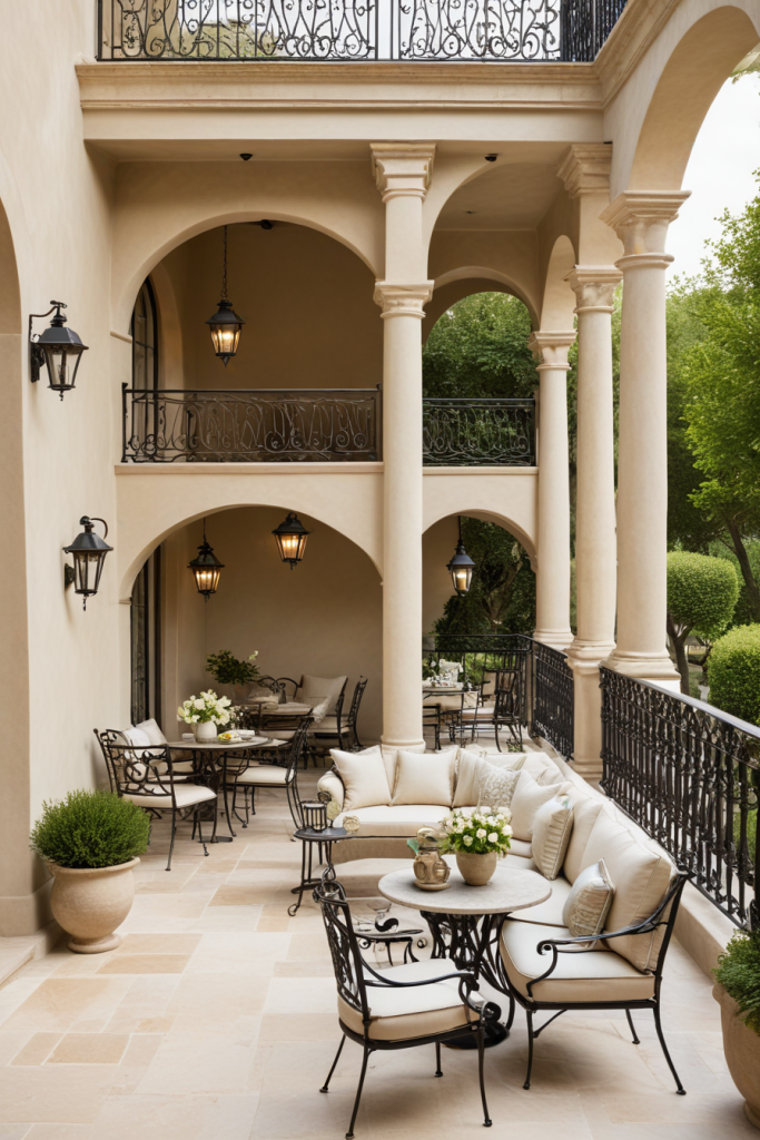 A traditional terrace features timeless decor, elegant furniture, and a balanced color palette. Choose wrought iron or wooden furniture with intricate carvings, neutral-toned upholstery, and classic outdoor lanterns for a refined aesthetic. Enhance the space with ornamental balustrades, stone flooring, and soft drapes, creating a serene and inviting ambiance.