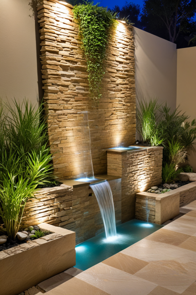 A relaxing terrace with water features creates a calm and soothing environment. Incorporate a cascading waterfall, a modern water fountain, or a reflecting pool to enhance tranquility. Use zen-inspired seating, soft lighting, and natural stone flooring to complete the peaceful setting, perfect for unwinding.