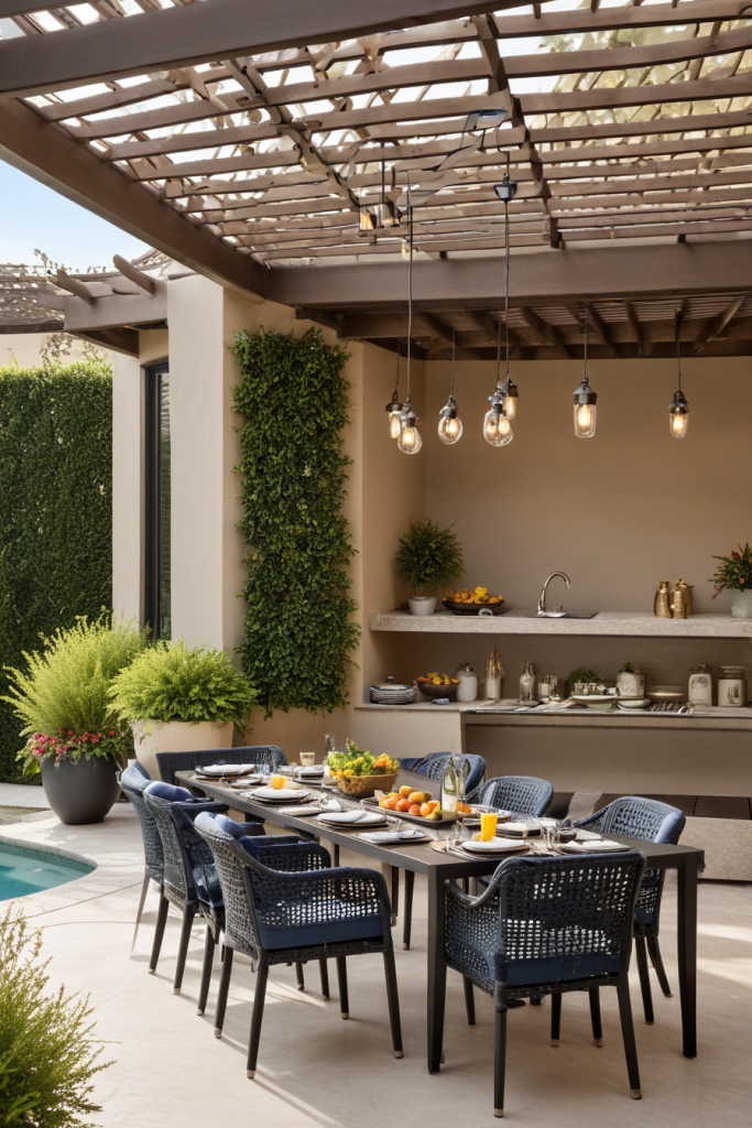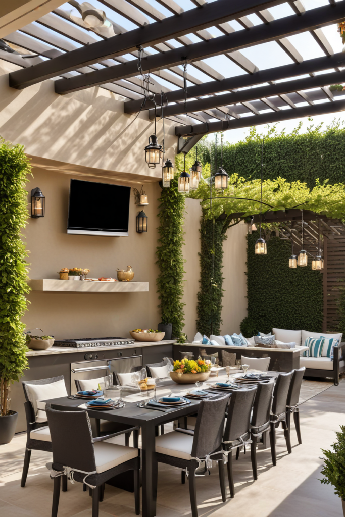 A terrace with a dining space is perfect for outdoor entertaining and social gatherings. Choose a sleek dining table, comfortable chairs, and a built-in serving counter for convenience. Enhance the ambiance with warm pendant lighting, decorative centerpieces, and a shaded pergola to create an inviting atmosphere for guests.