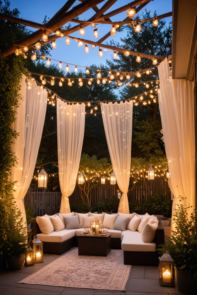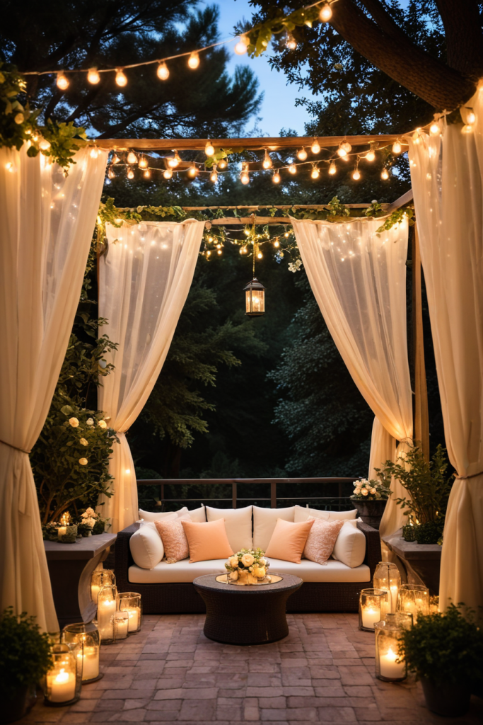 A romantic terrace focuses on soft textures, warm lighting, and intimate seating arrangements. Use flowing drapes, candle-lit lanterns, and plush seating to create a cozy ambiance. Incorporate twinkling fairy lights, sheer curtains, and floral arrangements to add an elegant and dreamy touch, perfect for unwinding in the evenings.