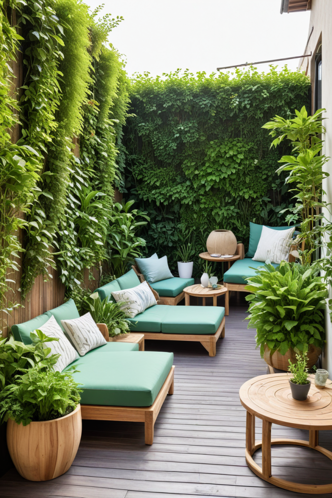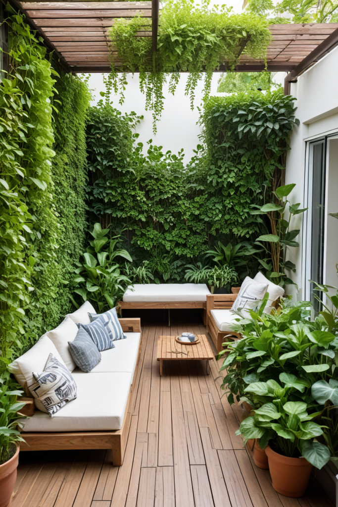 A green terrace maximizes natural beauty by integrating vertical gardens, potted plants, and climbing vines. Use bamboo planters, hanging greenery, and self-watering pots to maintain a fresh atmosphere. Complement the design with wooden flooring and rattan furniture, making the space feel like a private oasis.