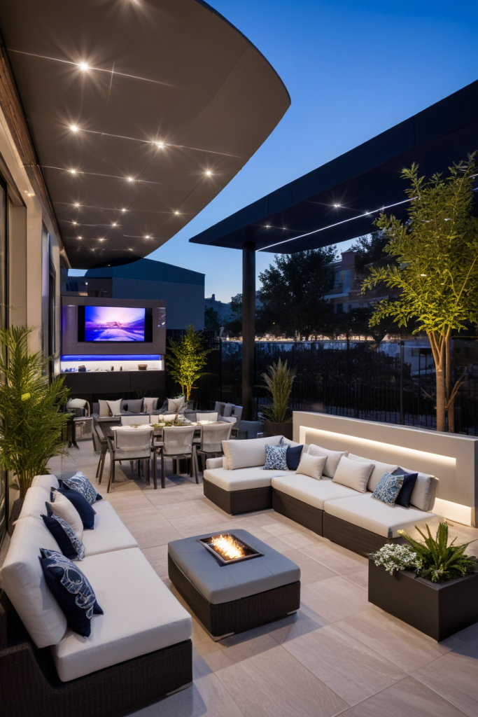 A high-tech terrace integrates modern technology for comfort and convenience. Incorporate smart outdoor lighting, built-in speakers, weather-resistant LED screens, and automated shade systems for a futuristic experience. Use sleek furniture with charging ports and voice-activated controls to enhance the terrace’s functionality while maintaining a sleek, high-end aesthetic.