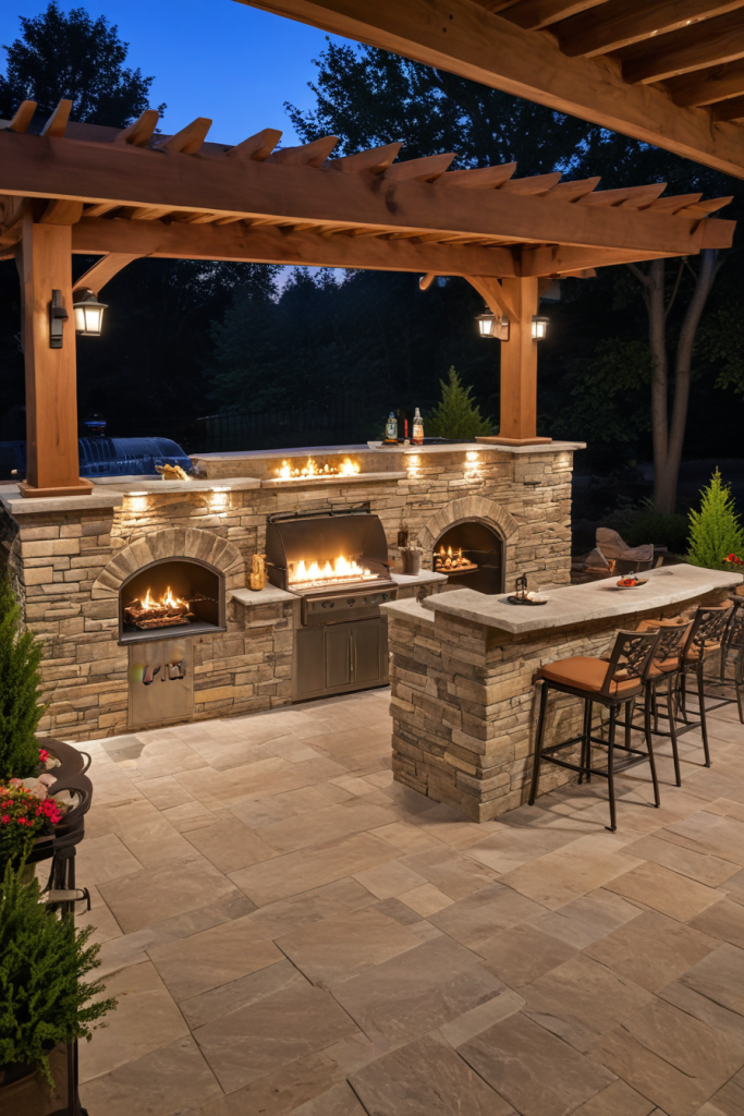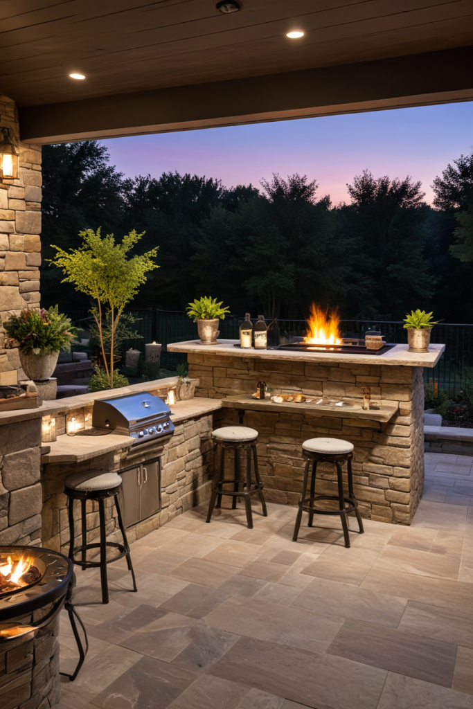 An open-air terrace with a built-in bar and grill is perfect for hosting outdoor gatherings and BBQ nights. Use a stone or stainless steel bar counter, high stools, and a fully equipped outdoor kitchen to make entertaining seamless. Add ambient lighting, a fire pit, and comfortable lounge seating to create a welcoming social space for friends and family.
