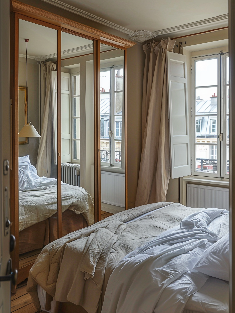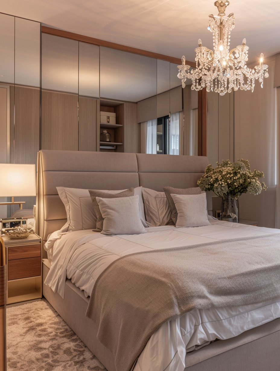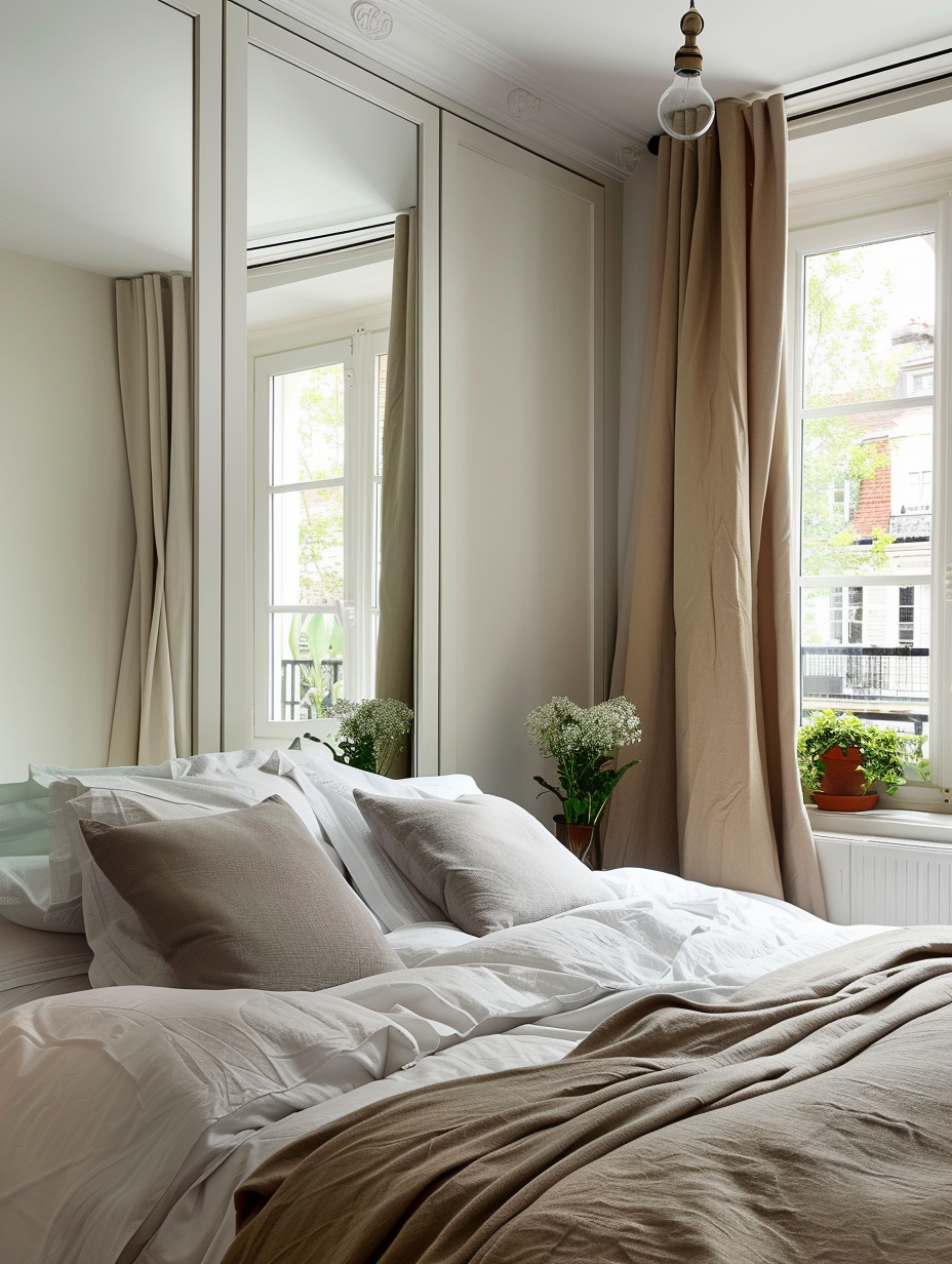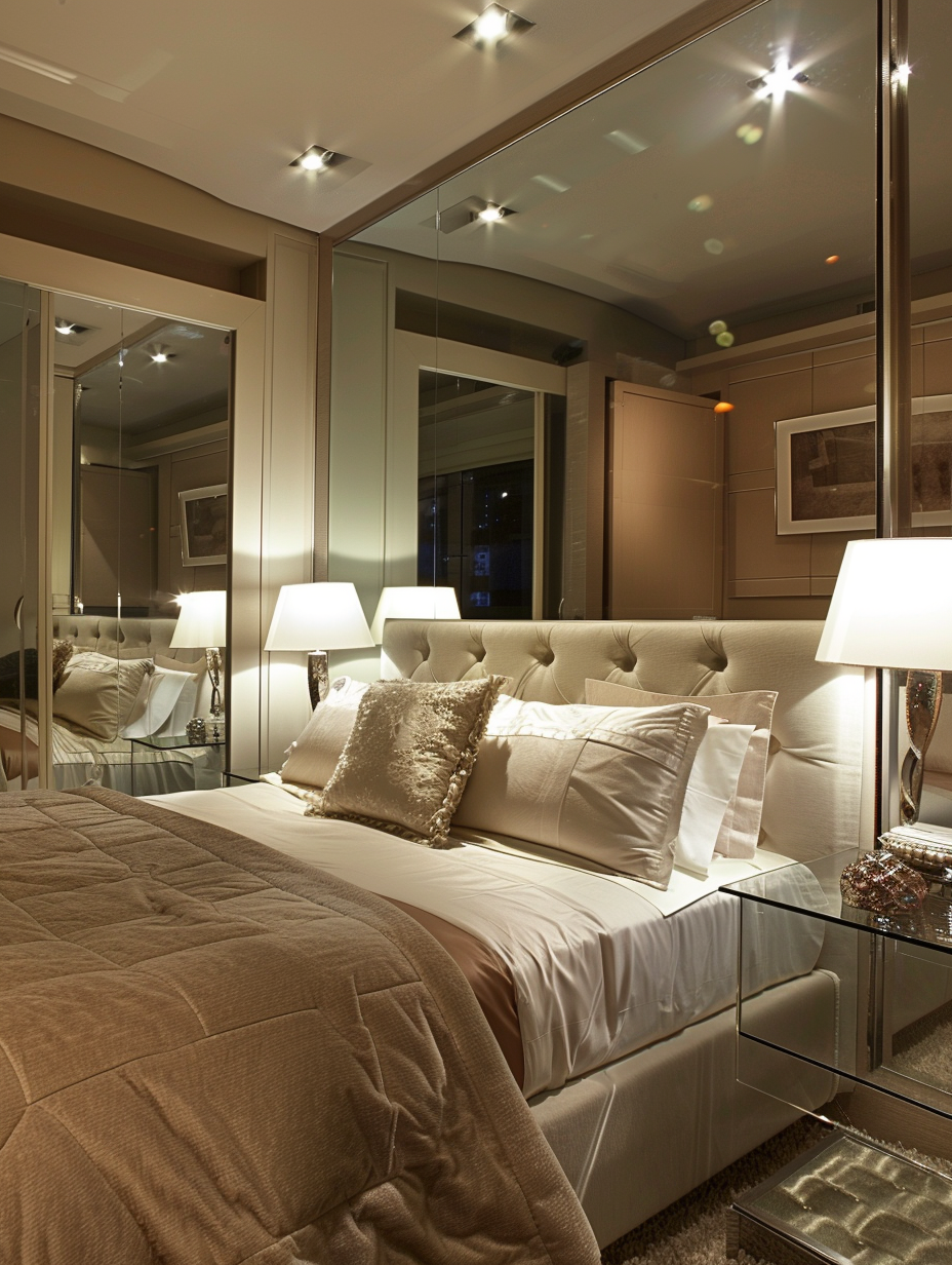 Mirrors can greatly boost the visual size of a tiny bedroom. A big mirror, which is placed wisely, is capable of reflecting the light and thereby make a real living space. You can go for a full-length mirror on a wardrobe door or a wide wall-mounted mirror to create a visually bigger space out of it.