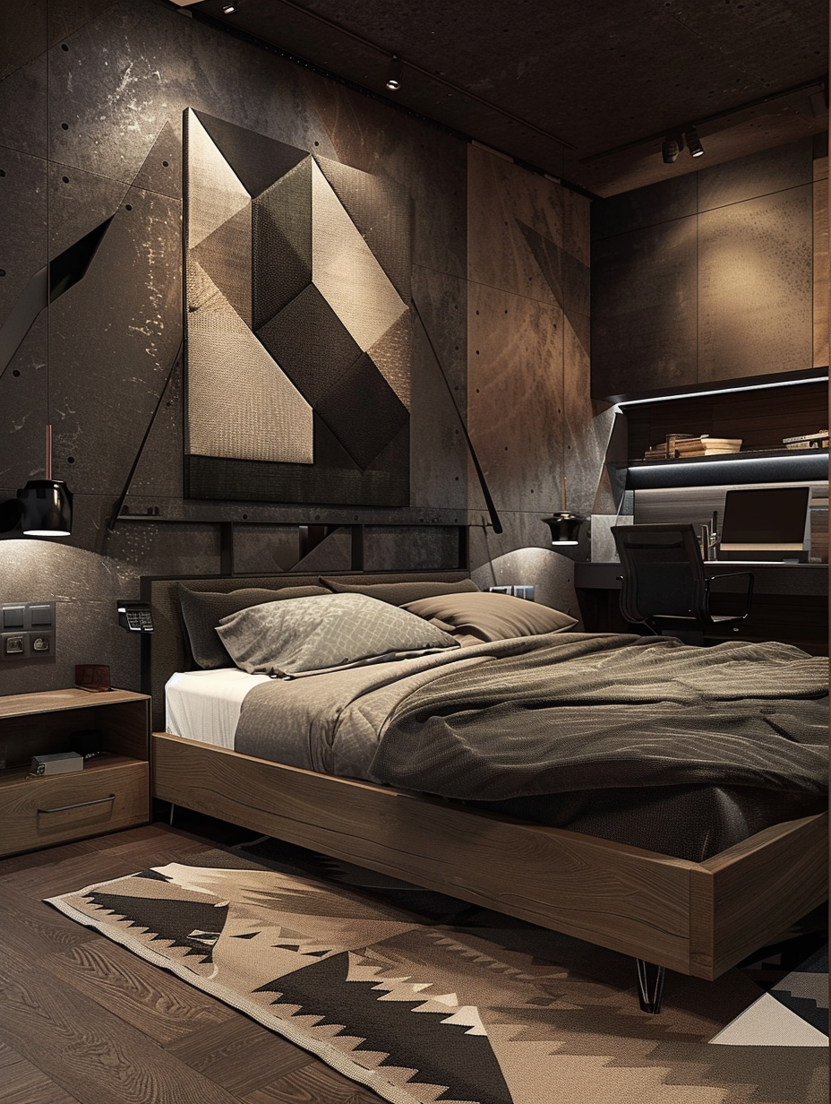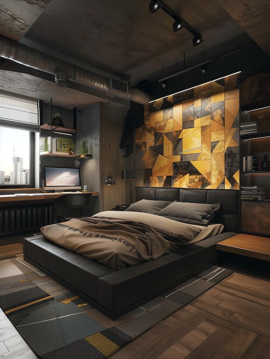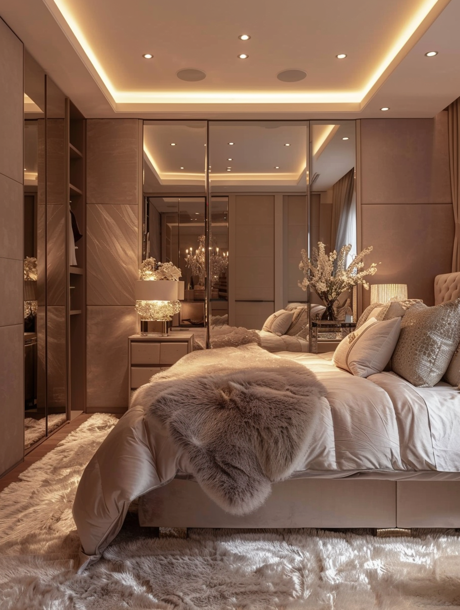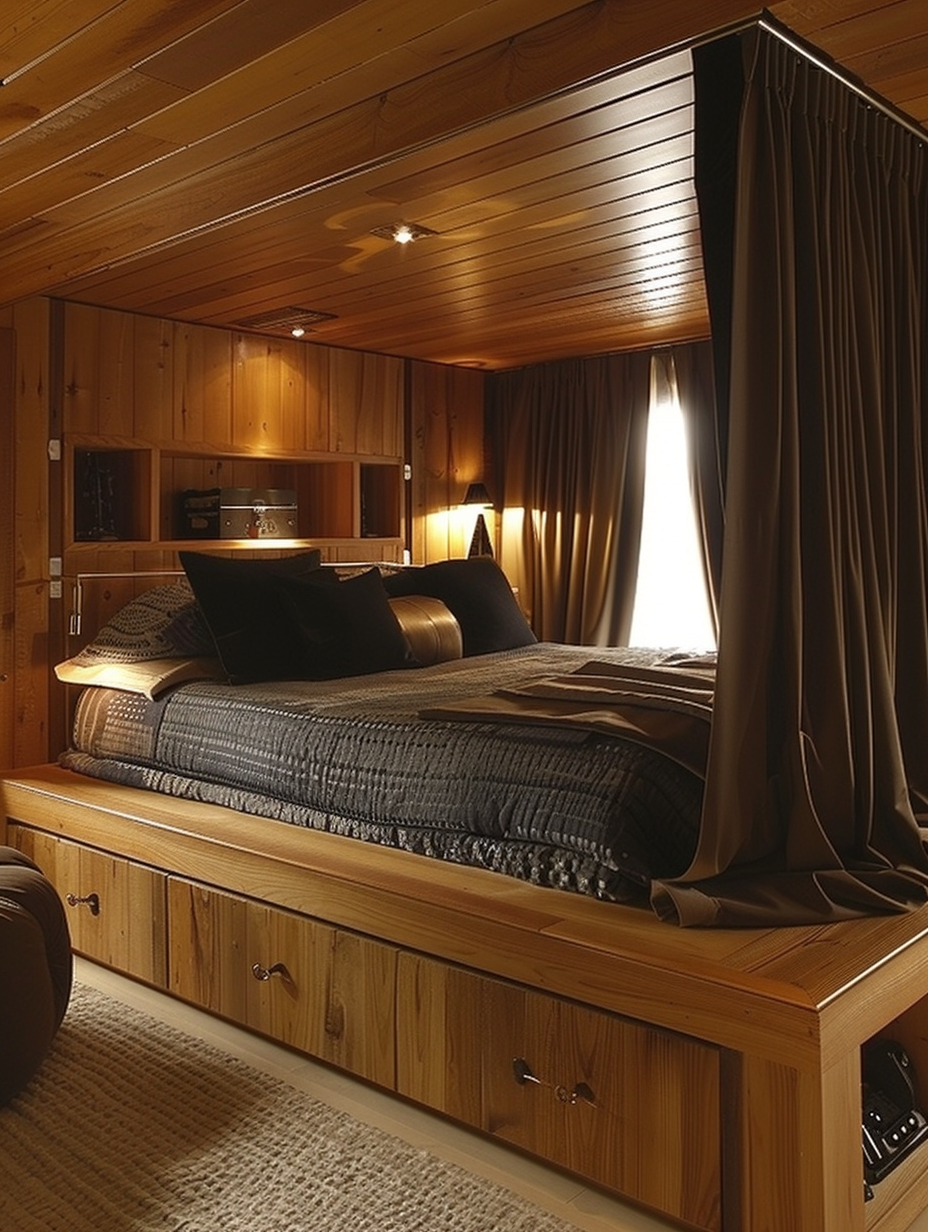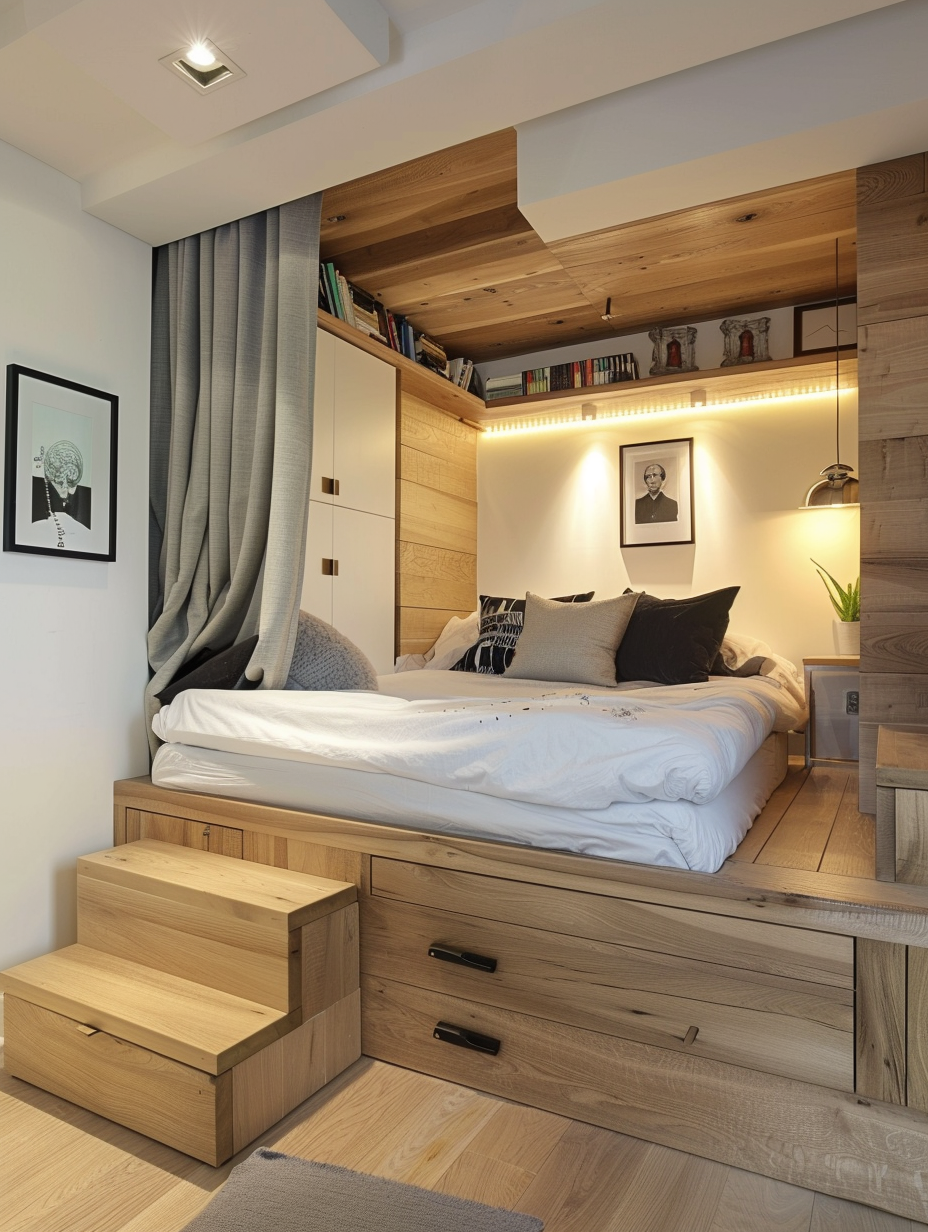 A platform bed with built-in drawers is a viable option for compact bedrooms. This bed provides a great deal of storage for the essentials like clothes and linens while still keeping things well-organized. Get a modern and solid bed that will help you to make the room look symmetrical so that the eye will be calmed down seeing totality.