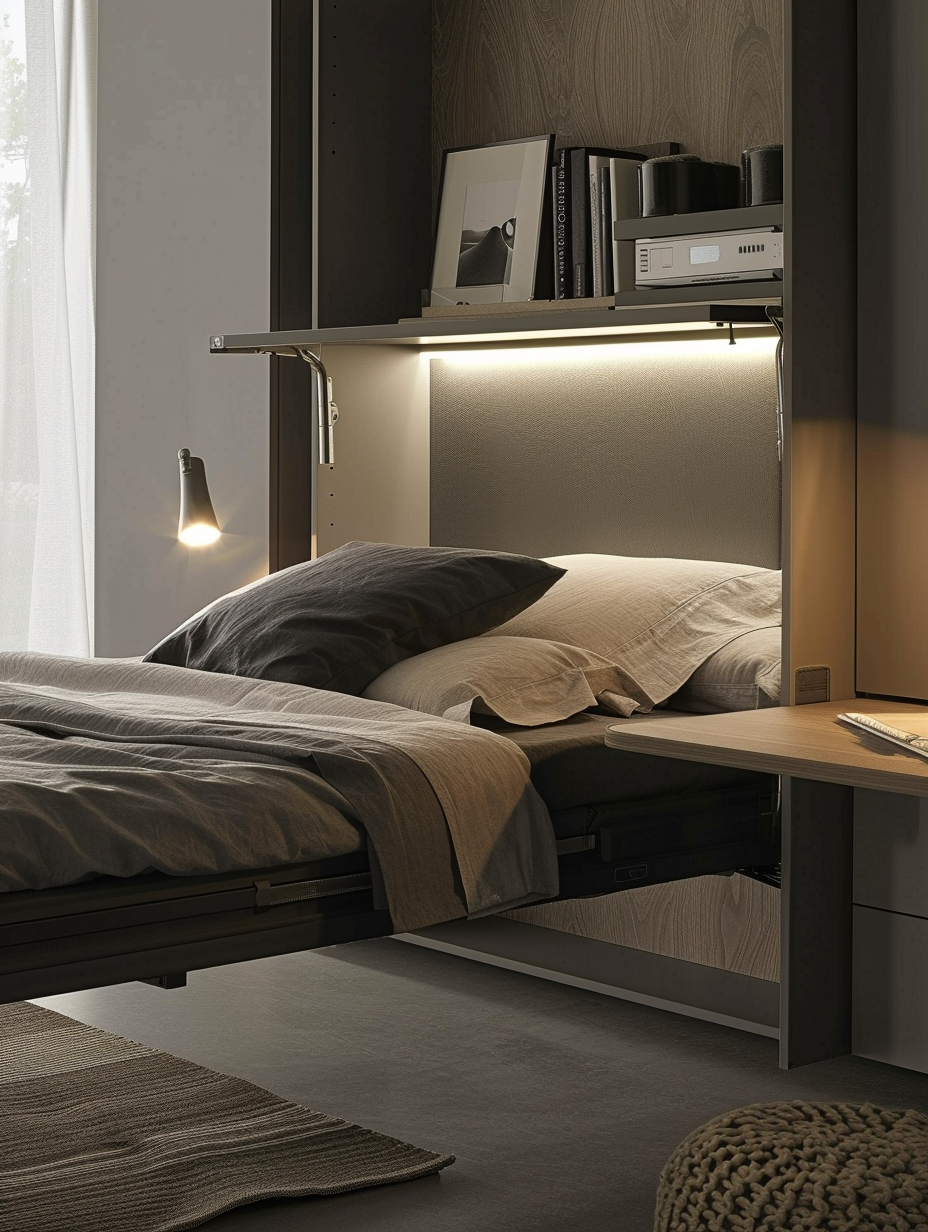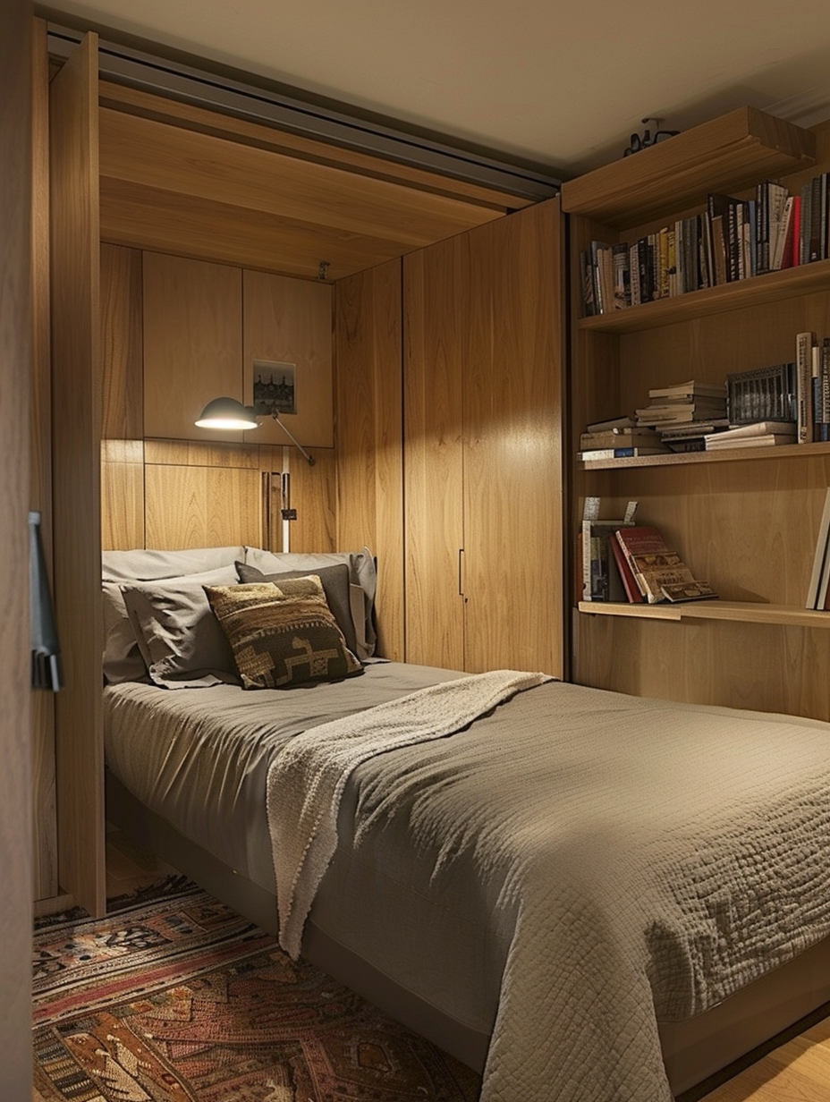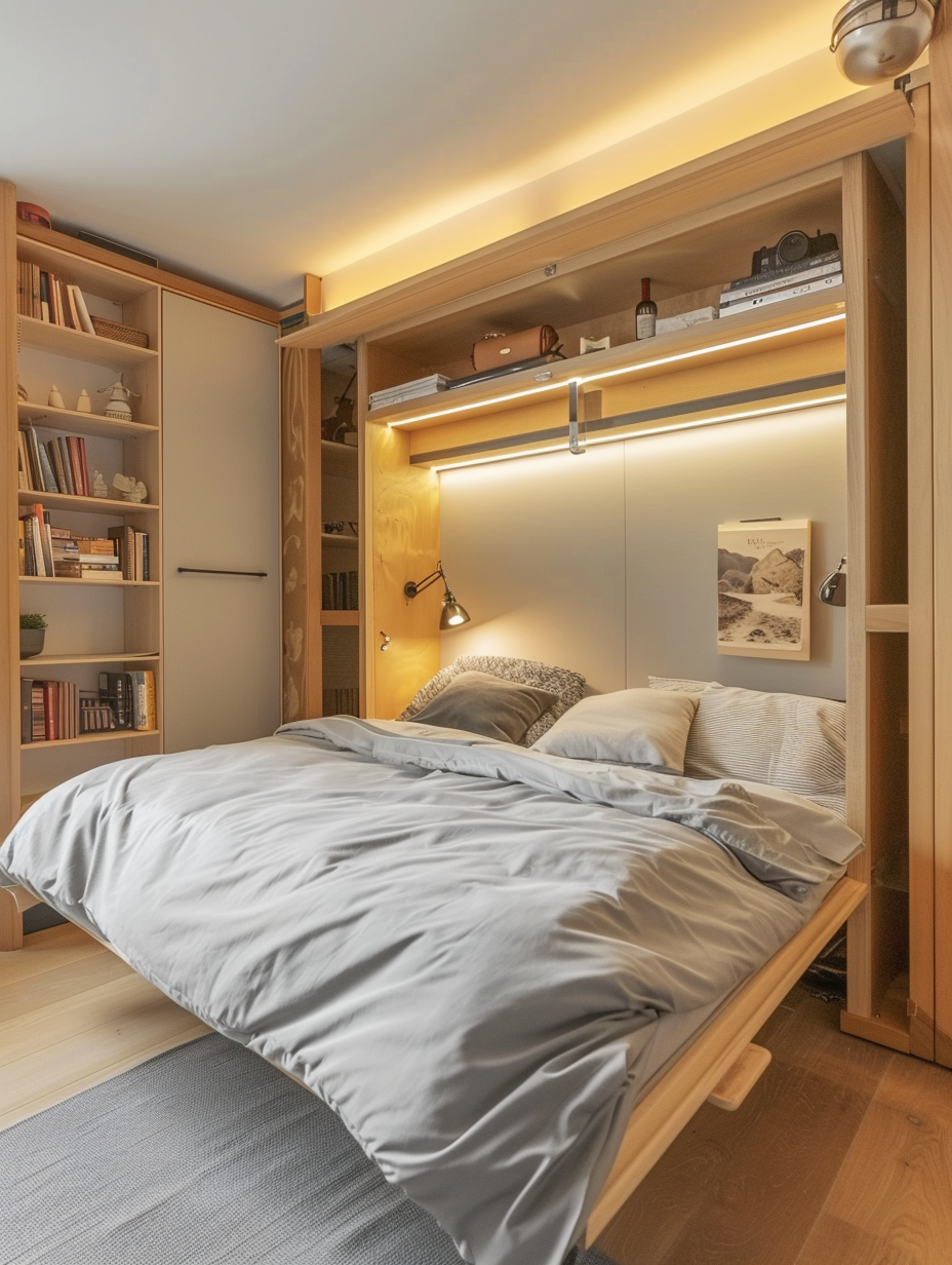 A Murphy bed is an extremely useful space-saving design for small bedrooms. When folded, it saves a spring-like zone which develops a free valuable floor position. Nowadays, you can choose a Murphy bed that provides you with extra features like built-in desks or shelves, and thus transformed it into a multifunctional piece of furniture that is perfect for small spaces.
