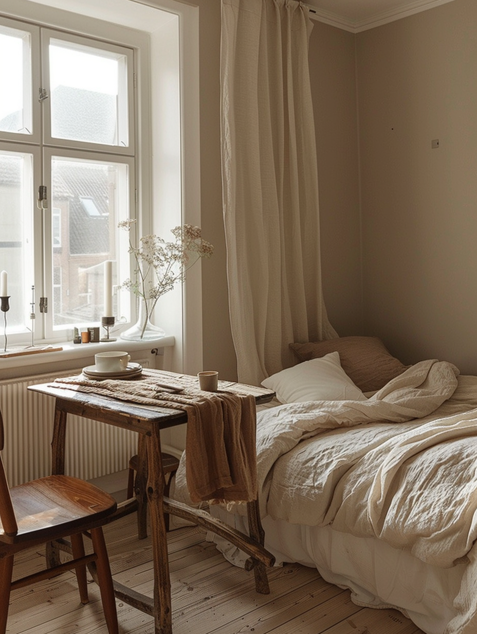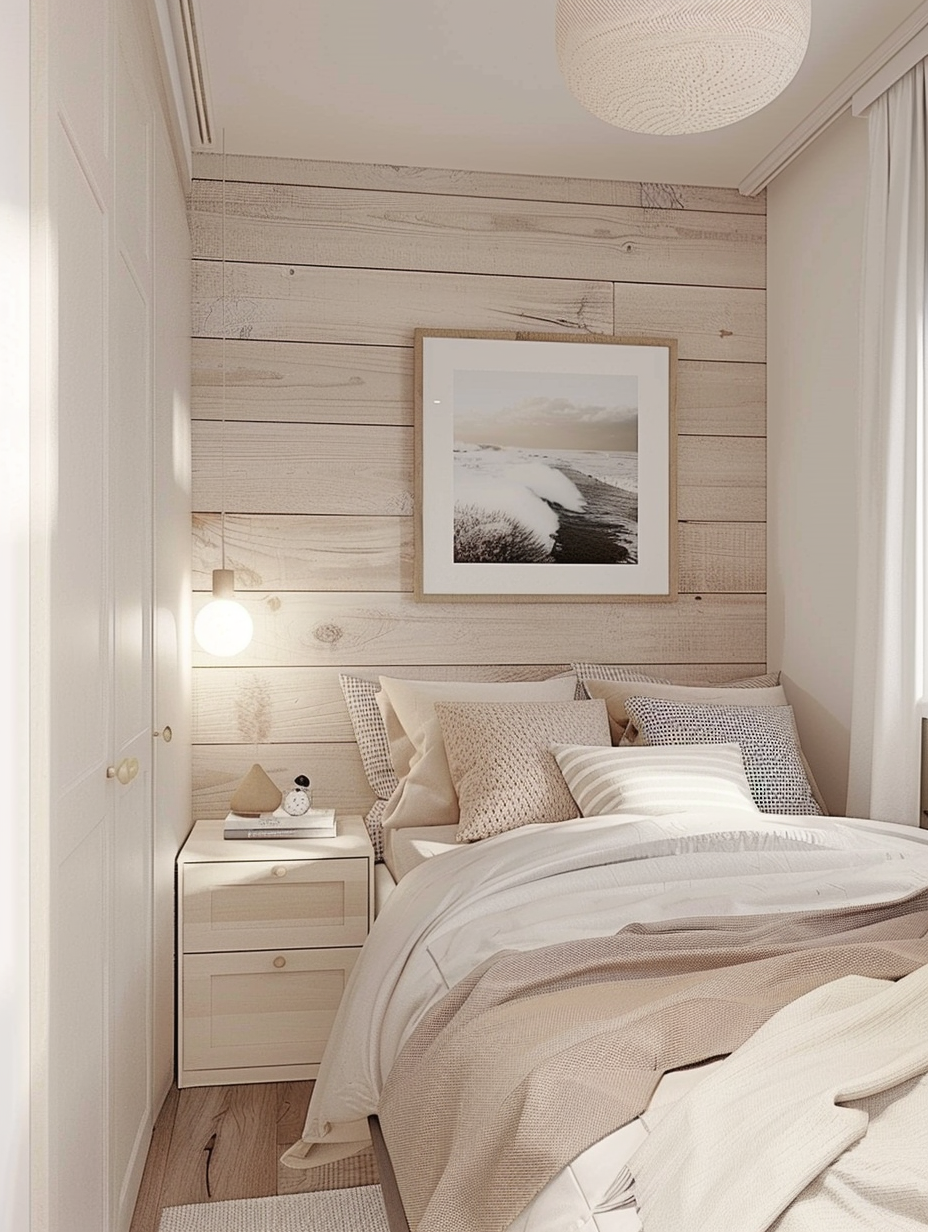 The small bedroom will look more spacious and peaceful using simple things. Use critical furniture elements and decor items are kept to a minimum. Pick a neutral color scheme to achieve the effect of more spaciousness and use subtle textures to keep it interesting. Apart from its size-impression aspect, this method is also about setting a peaceful and organized ambiance.