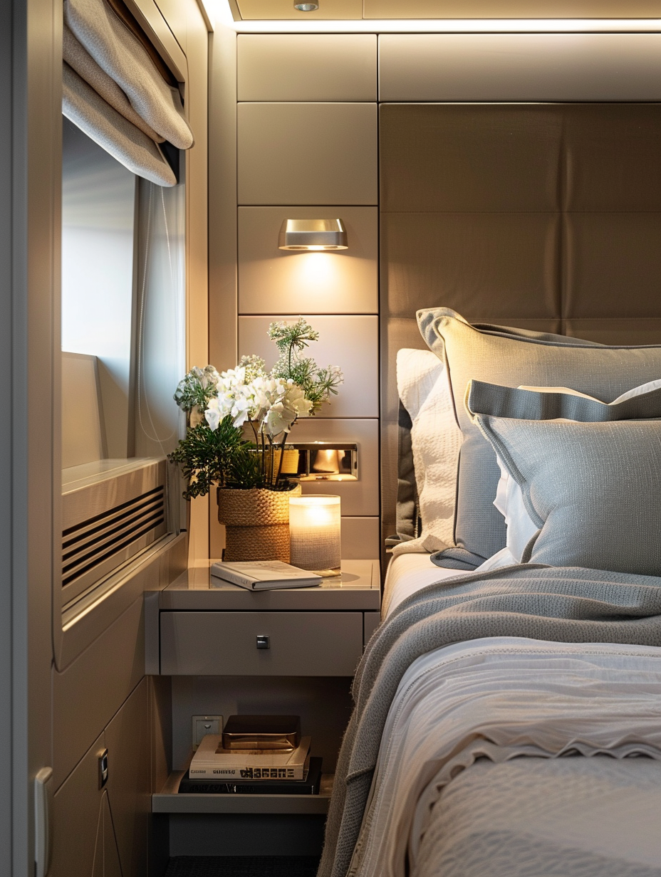 A mini nightstand is the best fit for tight bedrooms that have a shortage of space at home. Select an attractive style that is spacious enough to display necessary things, for example, a lamp, a book, and a phone. Go for a desk with storage that is built-in, for instance, a drawer, or a shelf, where small objects can be assorted together and be easily removed.