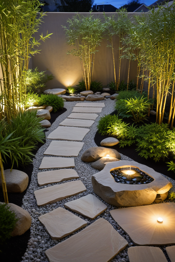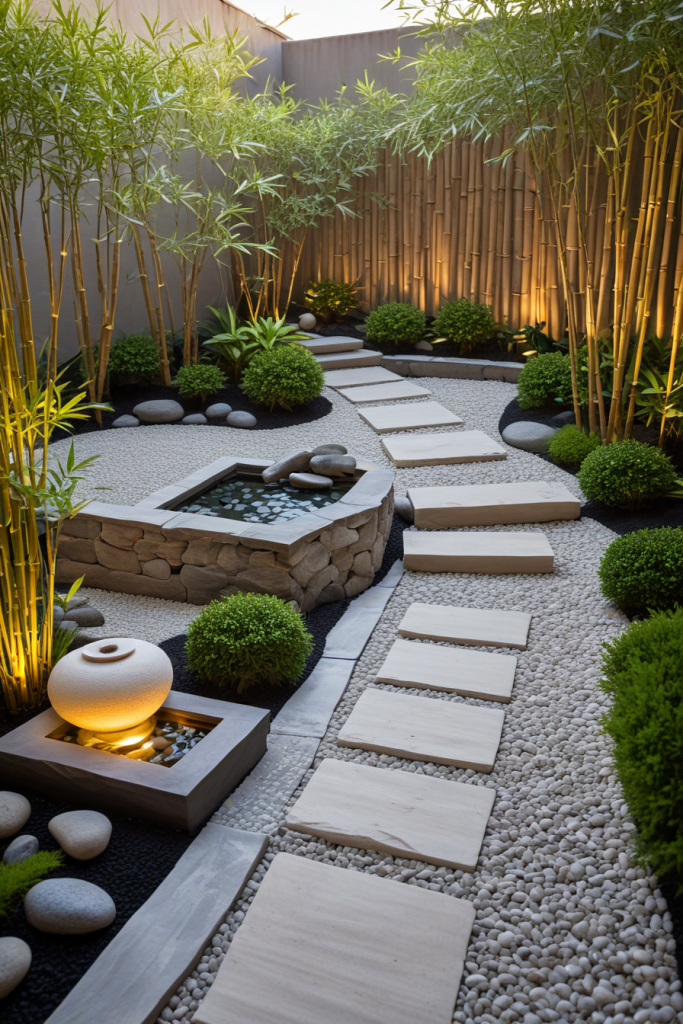 A Zen garden in a small backyard provides a calming and meditative atmosphere. Opt for gravel, smooth stones, and minimalist wooden elements to achieve a clean, tranquil design. Incorporate a small water feature, bamboo accents, or a sculptural focal point to enhance the peaceful vibe. Keep plant selections simple with bonsai trees, succulents, or ornamental grasses for an elegant, low-maintenance aesthetic.