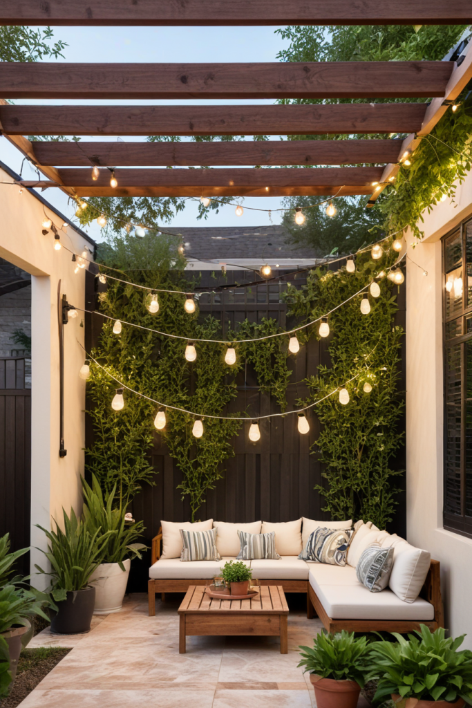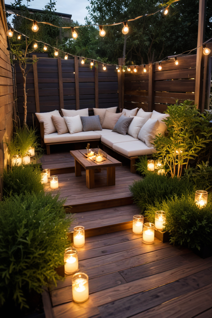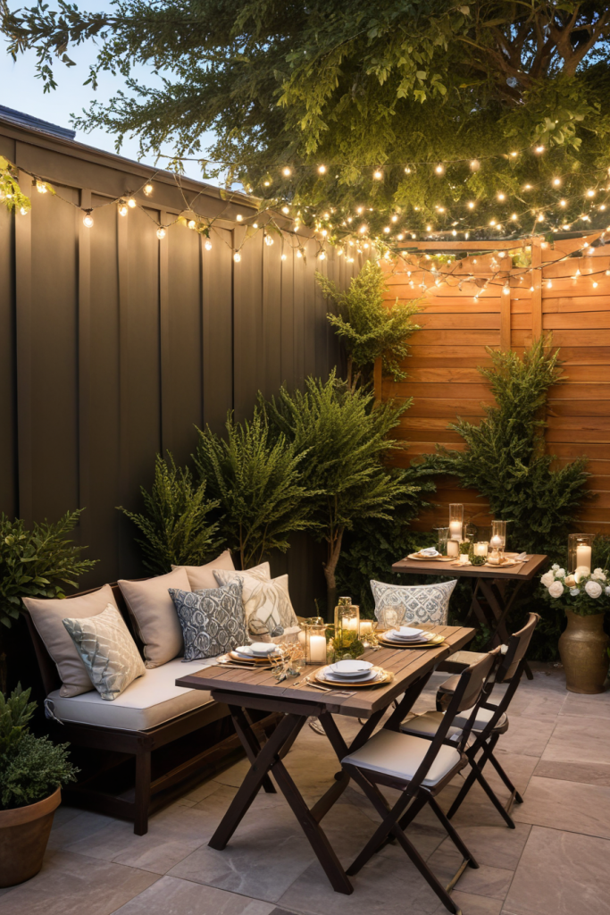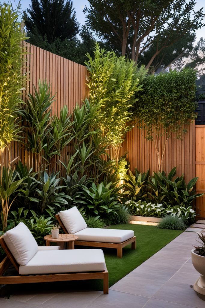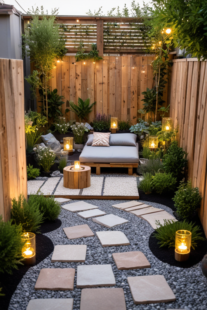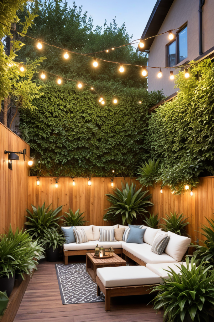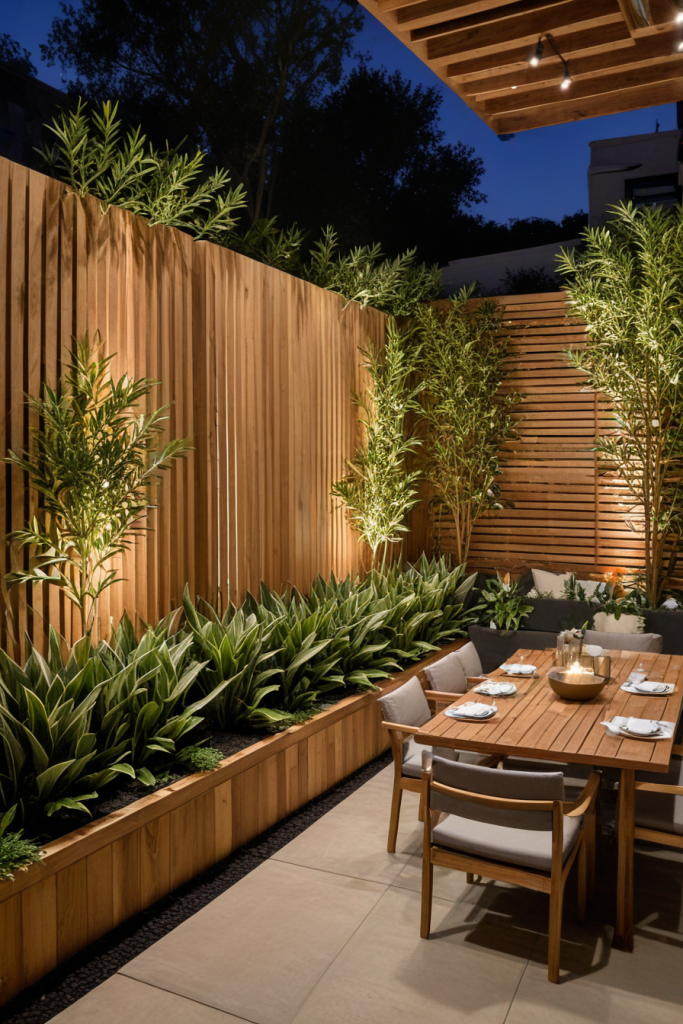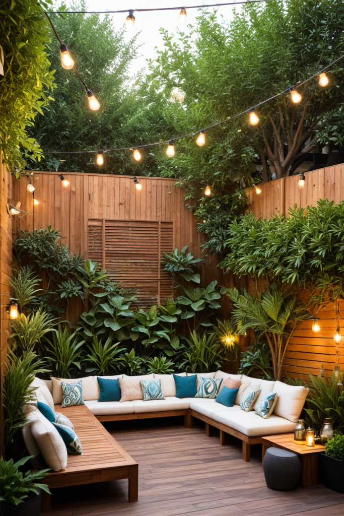 Privacy is essential for a tiny backyard oasis. Use wooden slat fences, decorative screens, or tall plants to create a sense of seclusion without closing off the space. Incorporate warm lighting to make the area feel more inviting.
