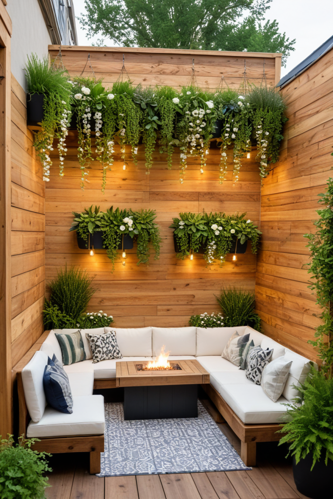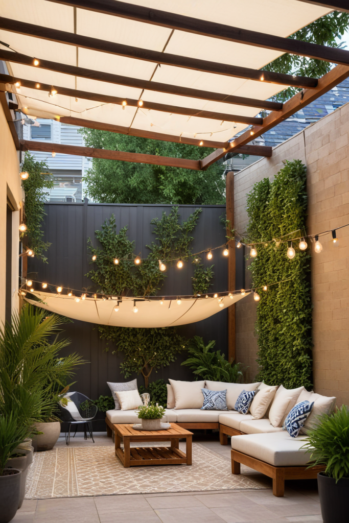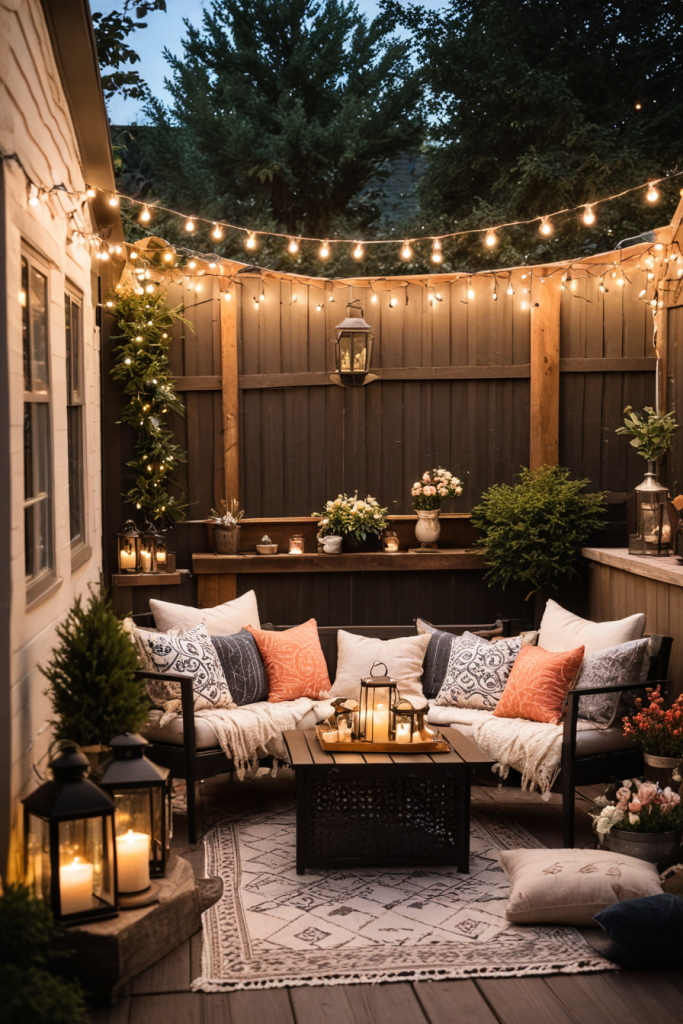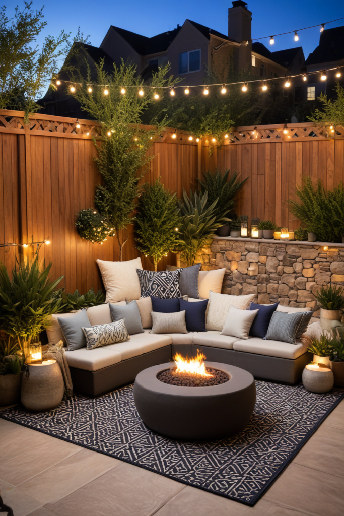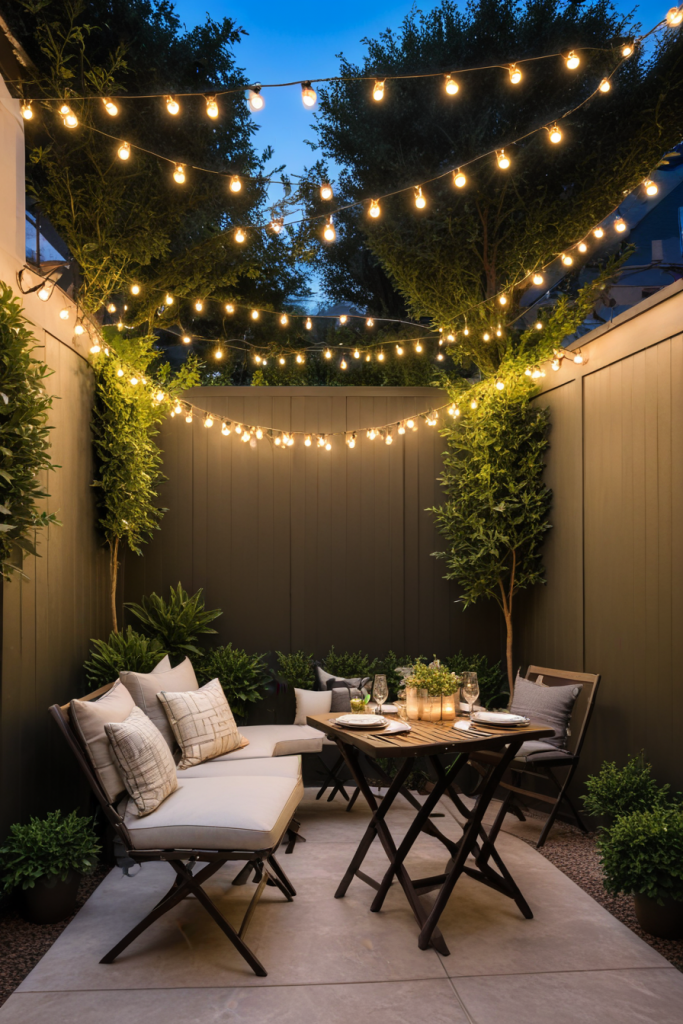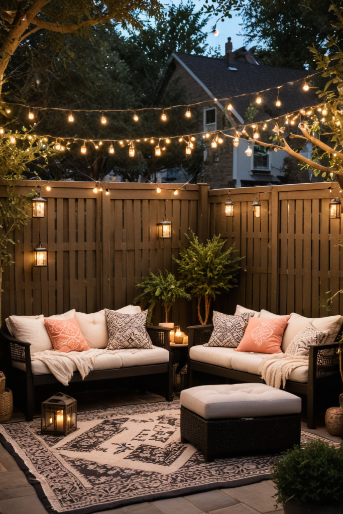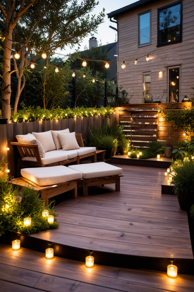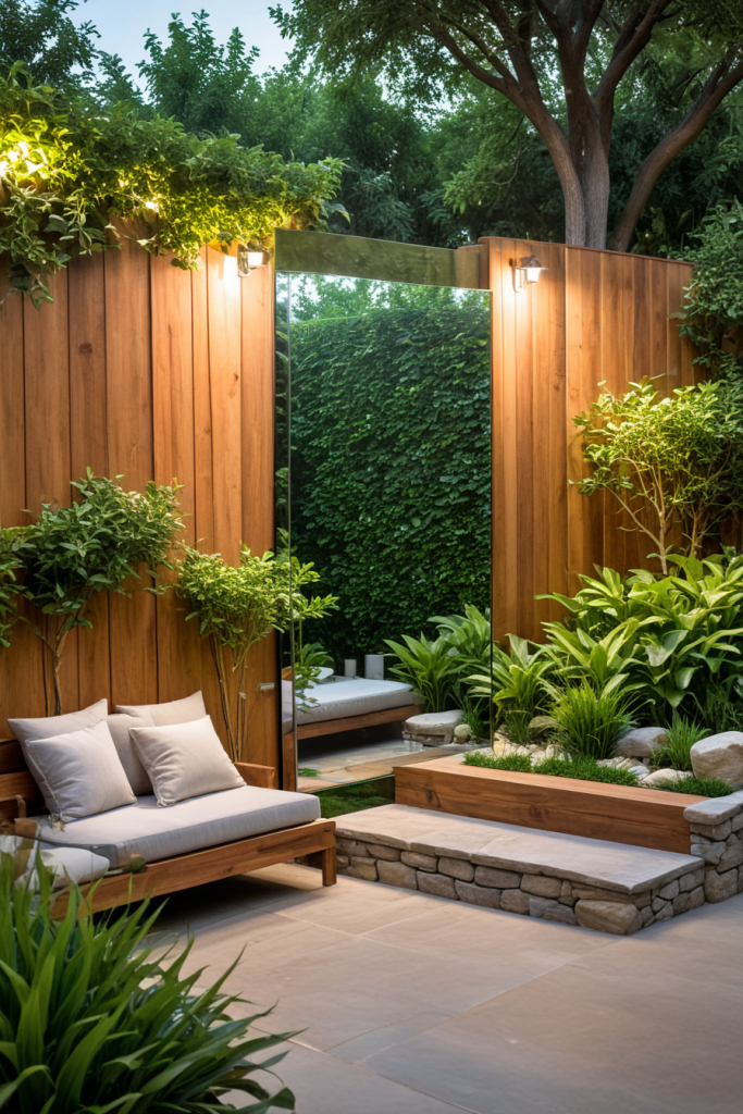 Privacy is essential for a tiny backyard oasis. Use wooden slat fences, decorative screens, or tall plants to create a sense of seclusion without closing off the space. Incorporate warm lighting to make the area feel more inviting.