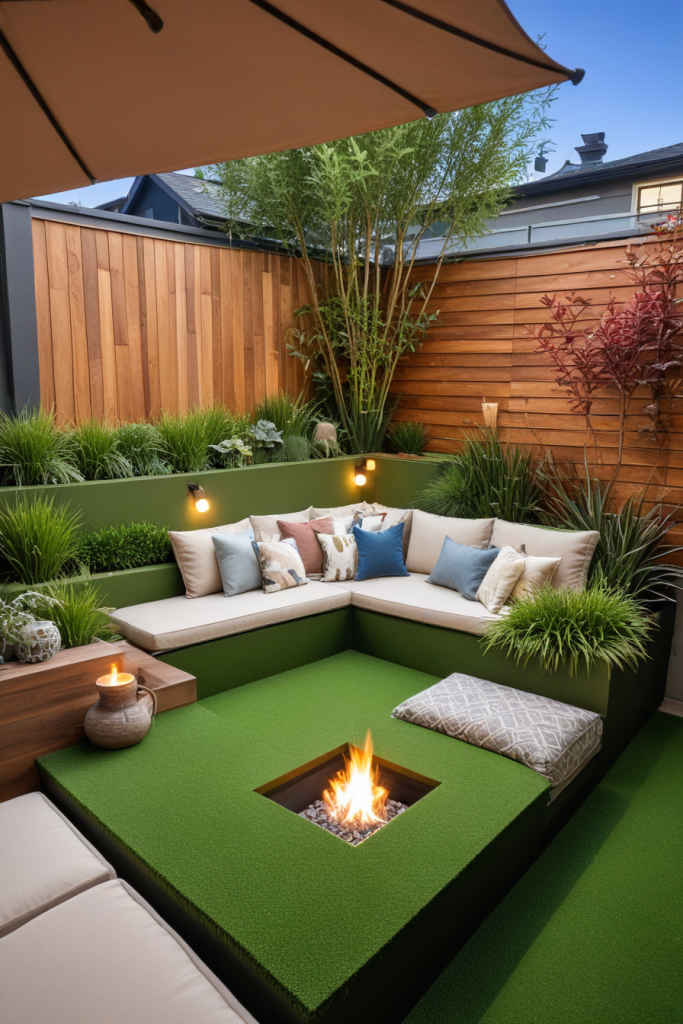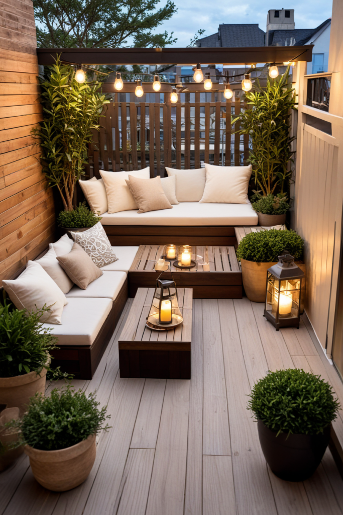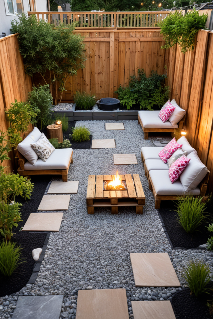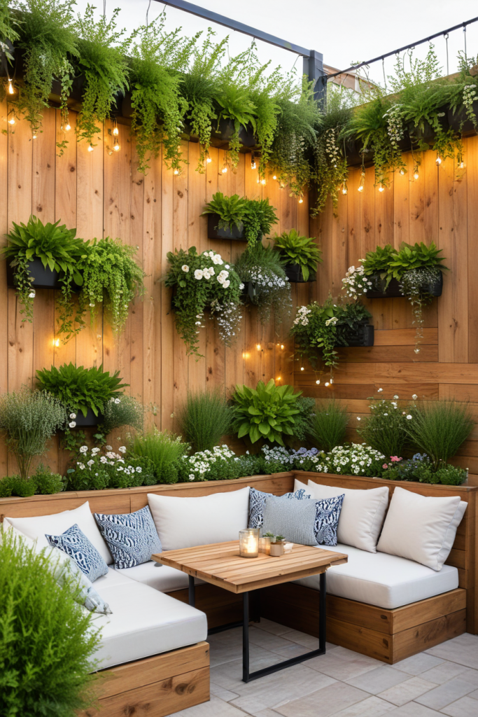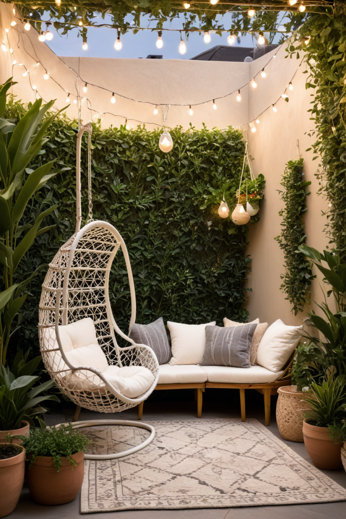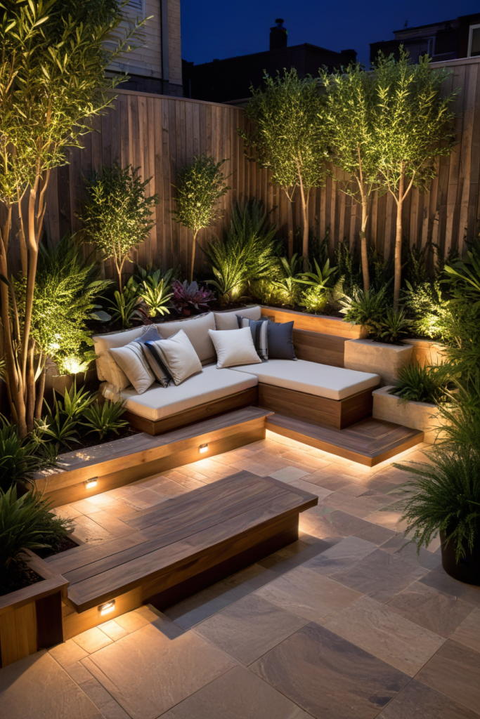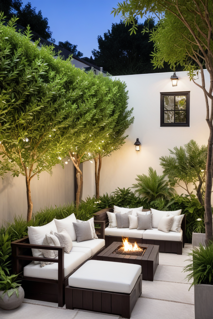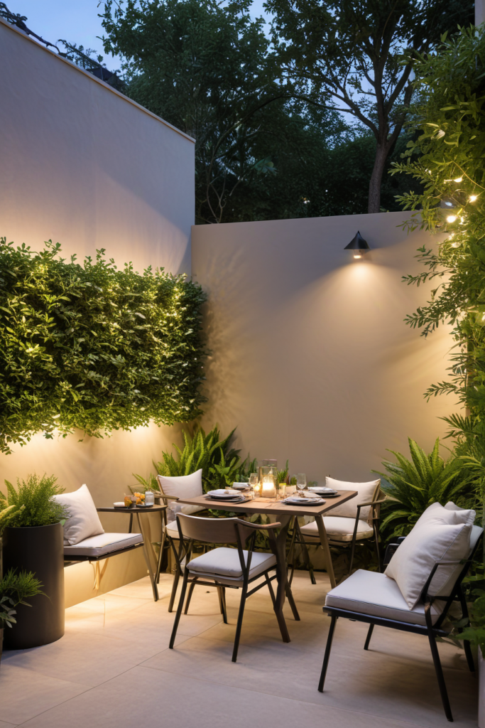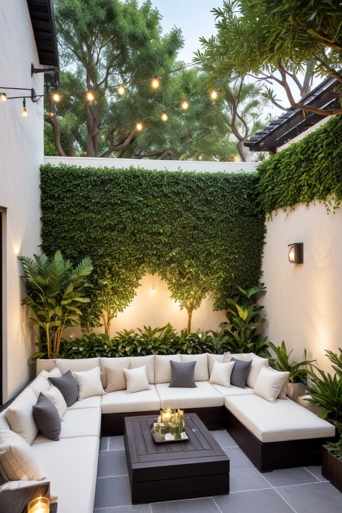 Privacy is essential for a tiny backyard oasis. Use wooden slat fences, decorative screens, or tall plants to create a sense of seclusion without closing off the space. Incorporate warm lighting to make the area feel more inviting.