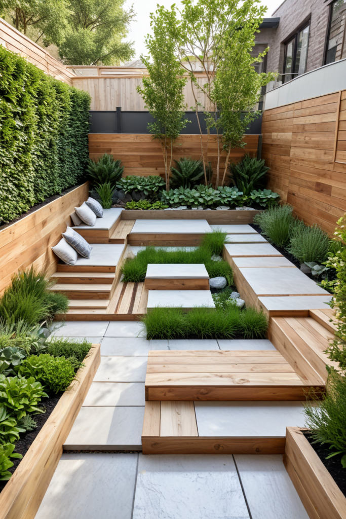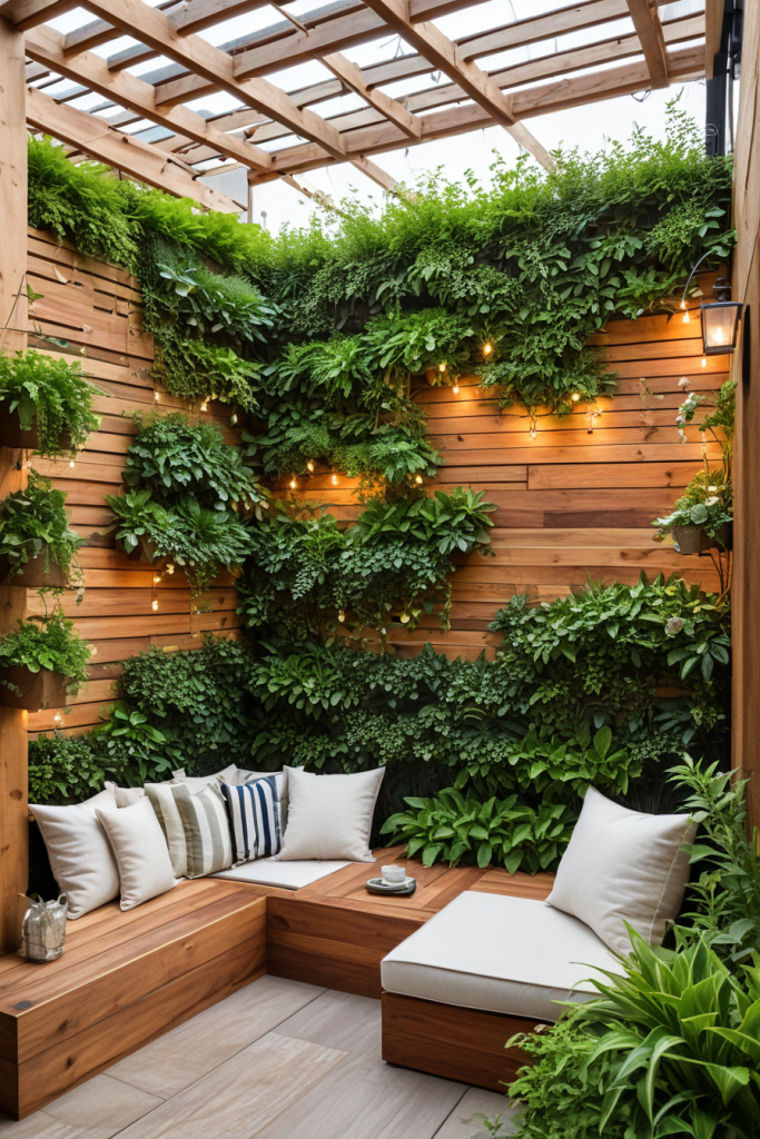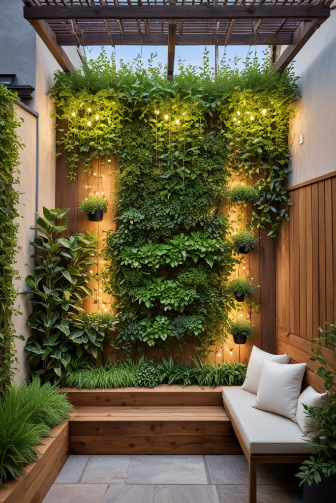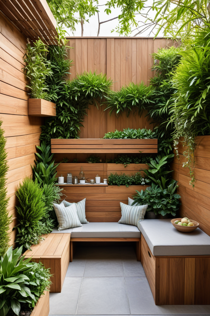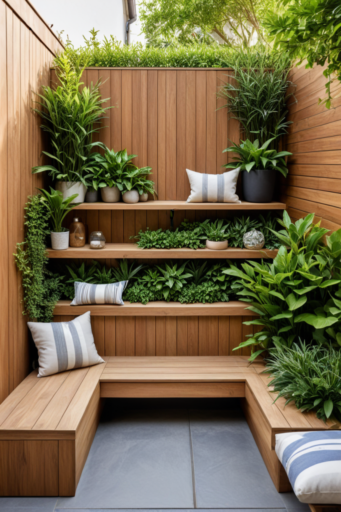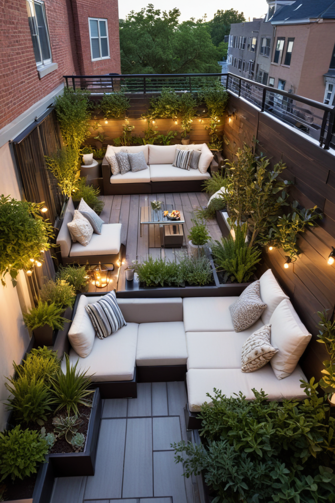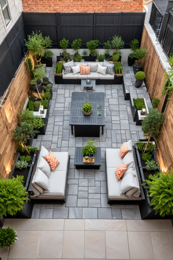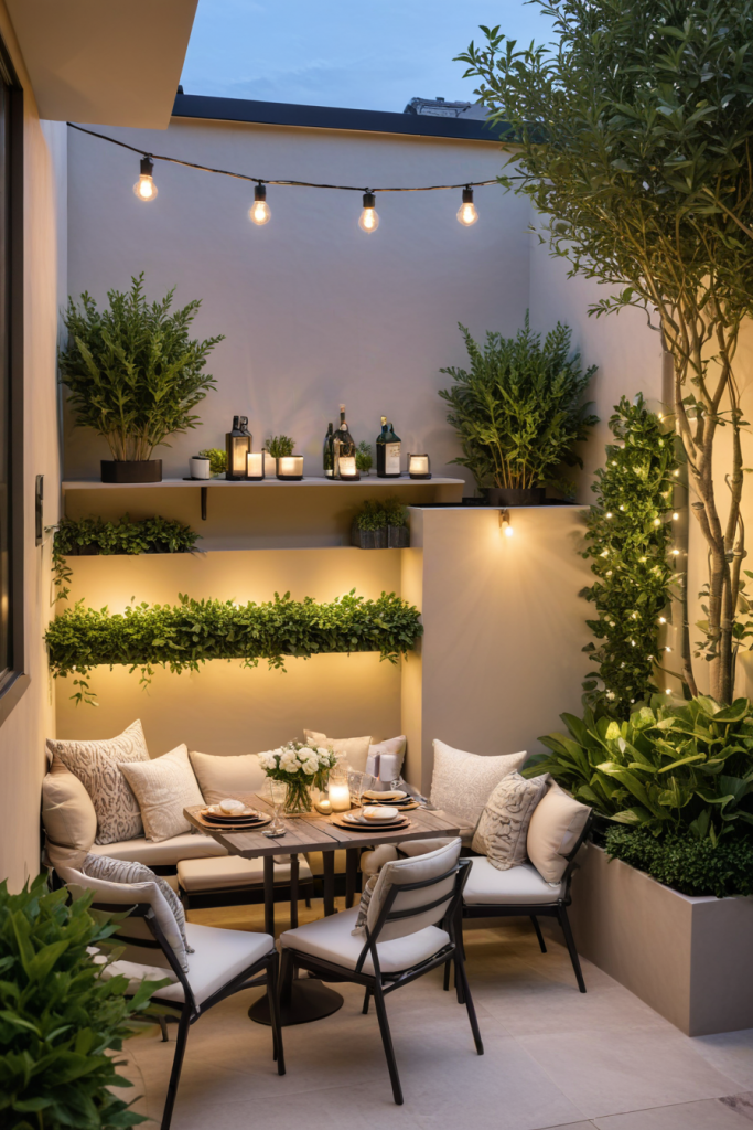 Privacy is essential for a tiny backyard oasis. Use wooden slat fences, decorative screens, or tall plants to create a sense of seclusion without closing off the space. Incorporate warm lighting to make the area feel more inviting.