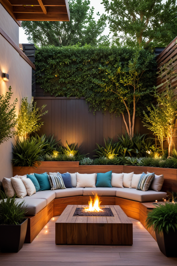 A fire pit adds warmth and charm to a small backyard, making it the perfect spot for gathering. Choose a compact, built-in fire pit or a portable tabletop model to fit the space. Surround it with built-in bench seating or small lounge chairs for a comfortable setup. Use natural stone, metal, or concrete to complement the outdoor aesthetic.