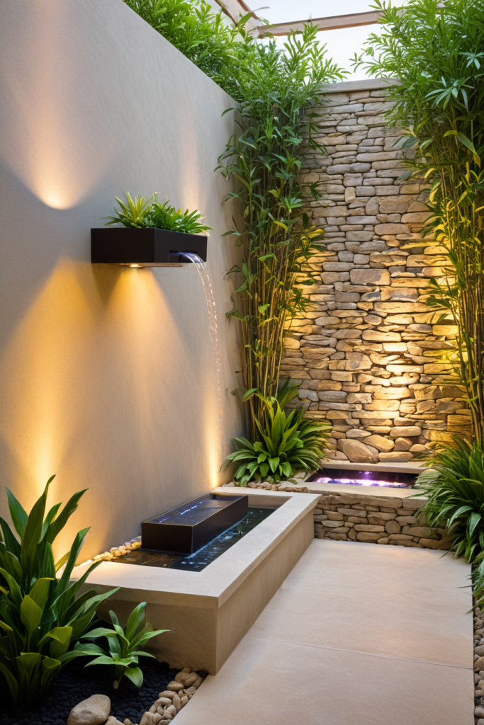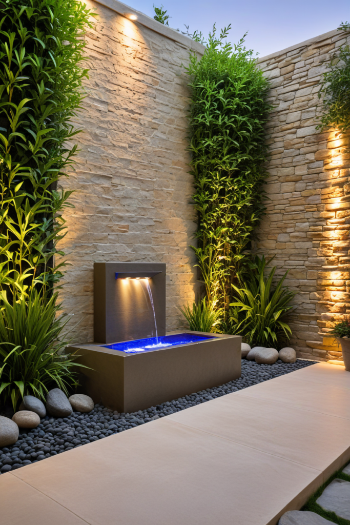 Incorporating a water feature into a tiny backyard creates a serene atmosphere. Opt for wall-mounted fountains, small cascading waterfalls, or narrow water basins that take up minimal space. Place the feature near a seating area to enjoy the soothing sound of flowing water. Combine with stone or metal accents for a natural look.