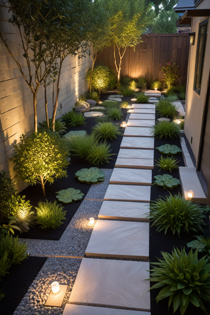 Proper lighting can make a tiny backyard feel warm and inviting after sunset. Use a combination of string lights, solar lanterns, and LED pathway lights to create depth and ambiance. Wall-mounted sconces help illuminate vertical spaces without cluttering the ground, while candles or fire bowls add a soft glow. Opt for warm white lighting to enhance coziness.