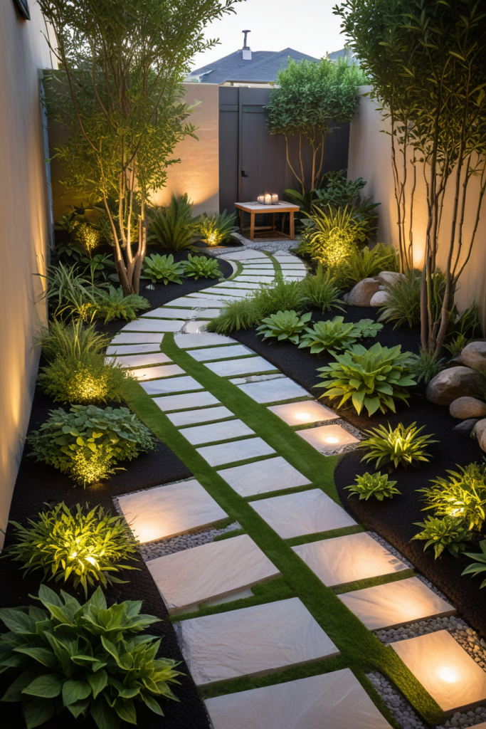 Pathways in a tiny backyard add both function and charm, helping define different sections of the space. Consider using natural stepping stones, geometric pavers, or wooden planks to create a visually appealing walkway. A zigzag pattern or curved path adds interest while making the yard appear larger. Surround the pathway with low-maintenance plants or decorative gravel for an effortless yet stylish look.