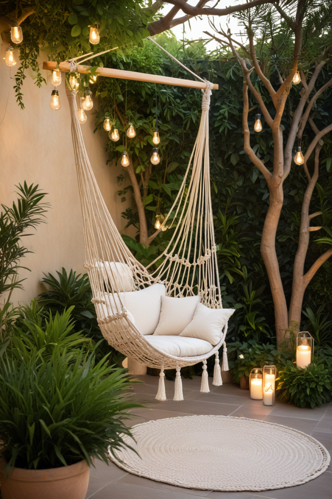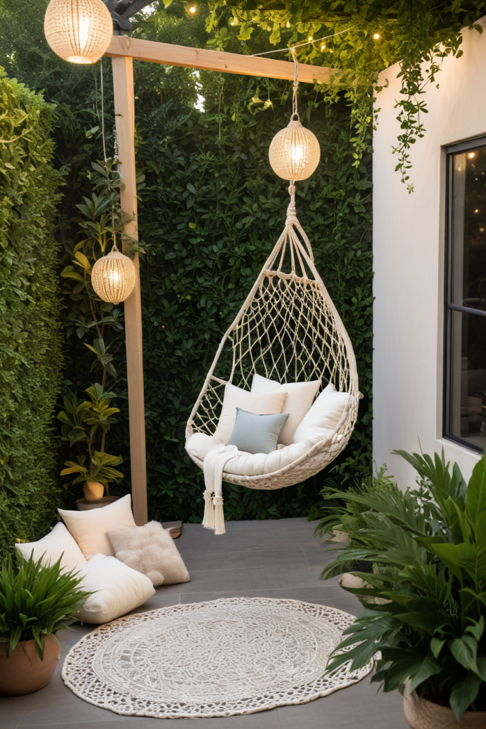 Adding a hammock or hanging chair to a small backyard instantly creates a cozy, relaxing retreat. Choose a compact rope hammock, a modern egg chair, or a macrame swing that complements the space. Hang it from a sturdy pergola, tree, or wall-mounted hooks for a floating effect. Pair with soft cushions and an outdoor rug to enhance comfort while maintaining a stylish, laid-back ambiance.
