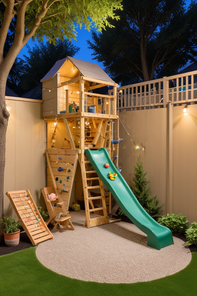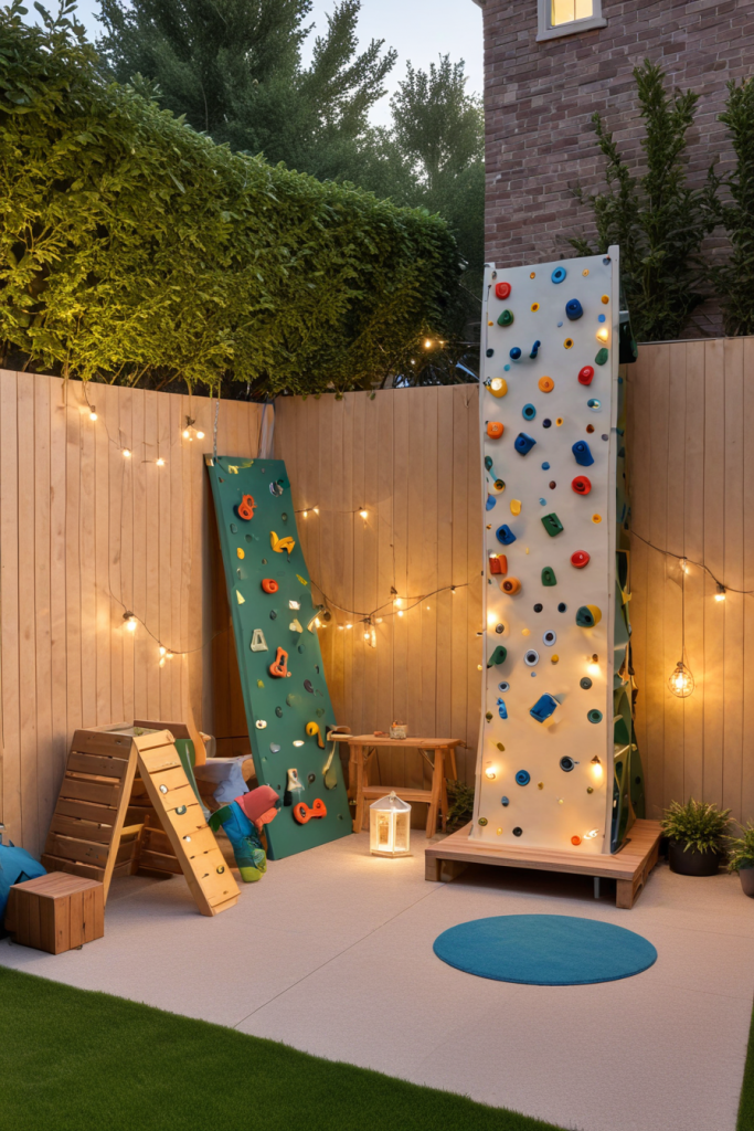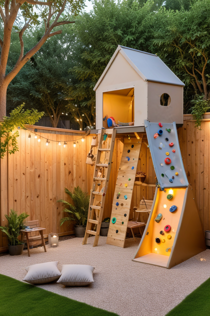 Even a tiny backyard can include a play area for kids with the right space-saving solutions. Consider foldable playsets, climbing walls, or compact sandpits that can be tucked away when not in use. Multi-functional furniture, like benches that double as toy storage, helps keep the area organized. A small chalkboard wall, swing, or DIY obstacle course adds fun without overwhelming the space.