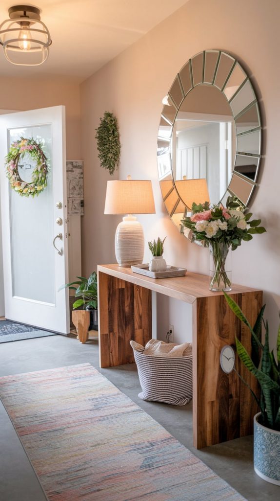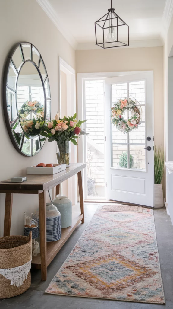 An inviting entryway sets the tone for your home’s Spring 2025 decor. Use a stylish console table adorned with fresh flowers, a large decorative mirror, and a woven basket for storage. Add a soft runner rug in pastel tones and a spring-inspired wreath on the door for a warm welcome. This combination of functional and trendy decor makes your entryway both practical and aesthetically pleasing.