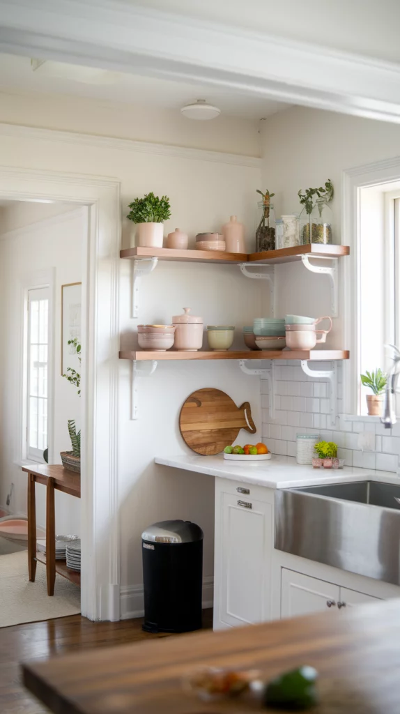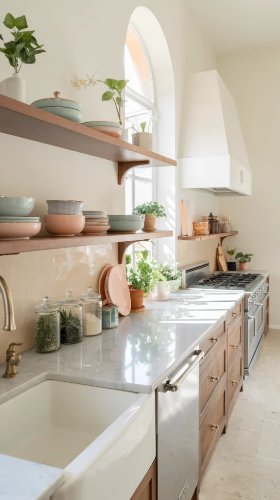 Open shelving is a top trend for kitchens in Spring 2025, offering a fresh and functional way to display your essentials. Use wooden or metal shelves to showcase pastel dishware, glass jars filled with herbs, or spring-themed decor like small potted plants. Open shelving not only makes your kitchen feel airy but also creates an opportunity to style it seasonally, adding charm and personality to the space.