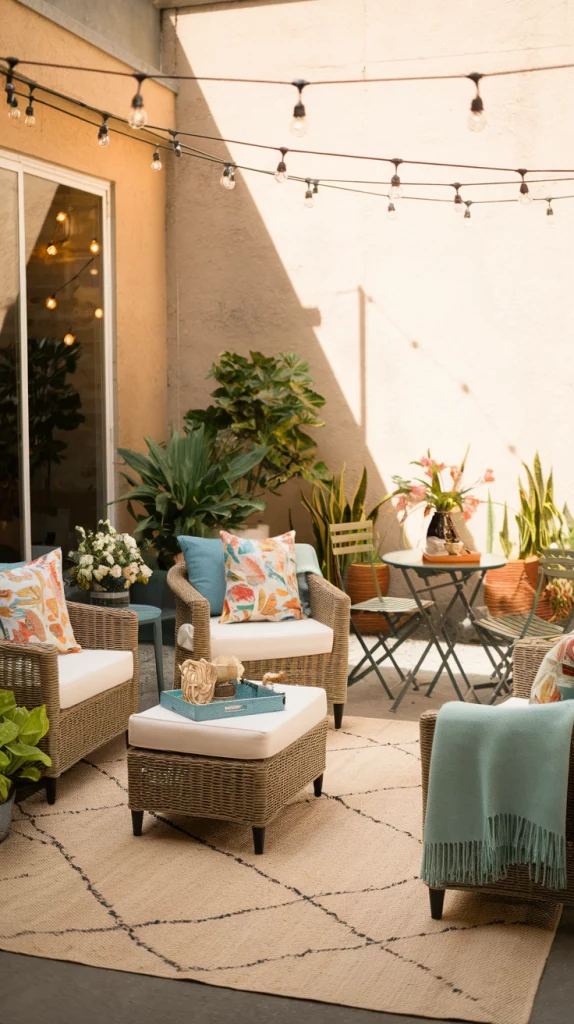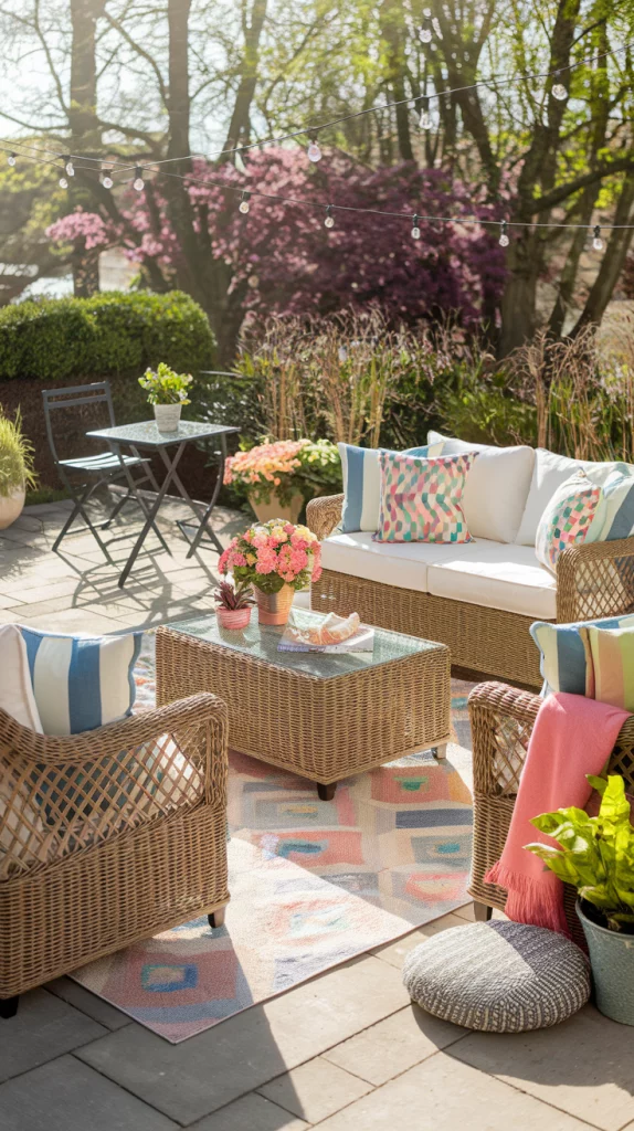 Get your outdoor space ready for spring with a stylish patio makeover. Incorporate furniture made from wicker or teak, paired with vibrant outdoor cushions in spring-inspired colors or patterns. Add a bistro set, string lights, and potted plants for a cozy, inviting atmosphere perfect for entertaining. Don’t forget a large outdoor rug and lightweight throws to make the space feel as comfortable as your indoor areas.