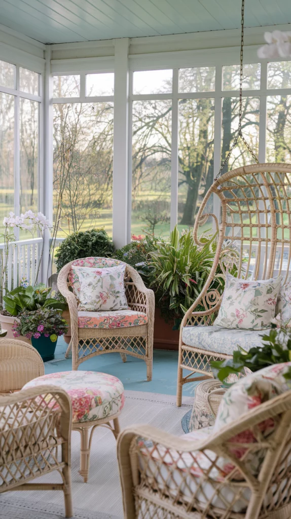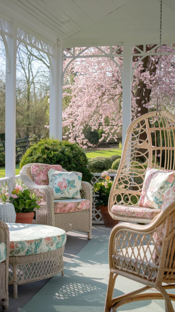 Wicker and rattan furniture are ideal for creating cozy and stylish spring verandas. These materials exude natural charm and are perfect for Spring 2025 decor. From chairs and sofas to coffee tables and hanging swings, rattan and wicker pieces are versatile and lightweight. Add pastel or floral cushions for a seasonal touch and pair them with potted plants for a truly inviting outdoor space.
