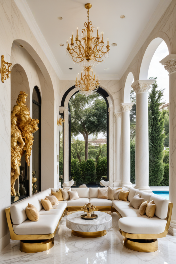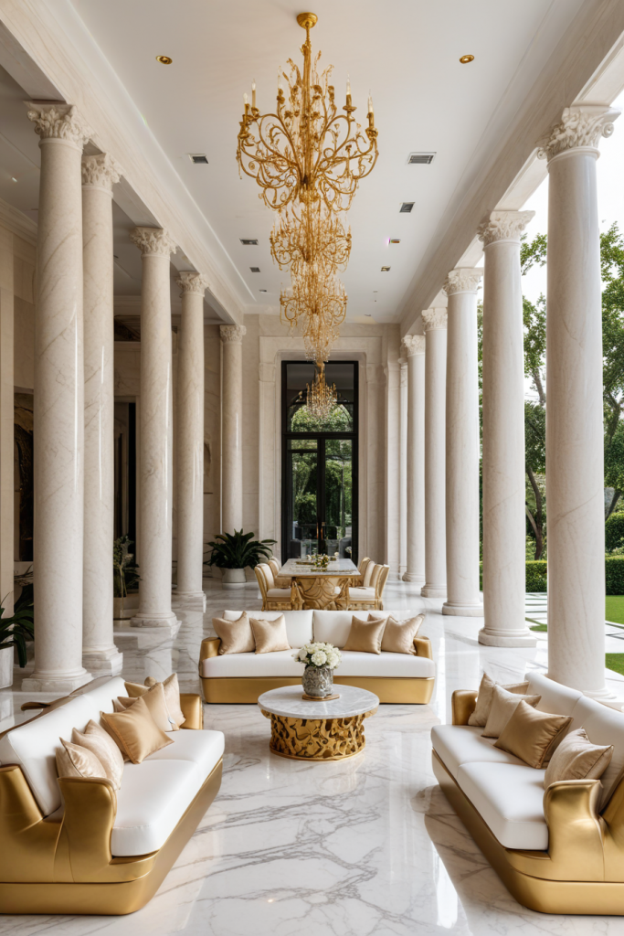 I would like to know what a luxurious veranda looks like in terms of material, sitting, and decor for example. So I can better imagine gold furniture, sculptures, and extravagant chandeliers alongside marble flooring. Statement lighting and large outdoor sofas further elevate the setting.