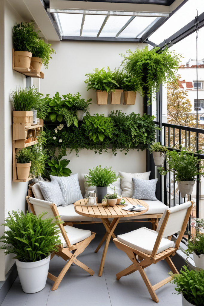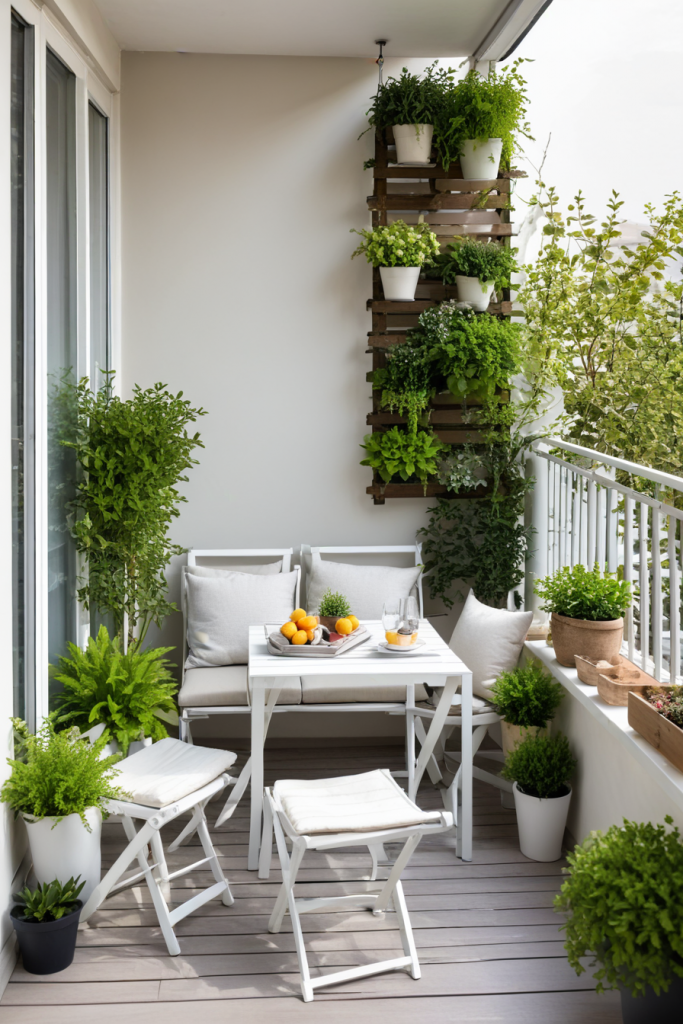 To appear open and chic, small verandas need smart design decisions. The use of wall-mounted seats, foldable furniture, and vertical gardens increase the area available. Mirrors and light colors give the illusion of increased space.